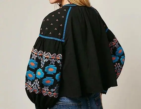 Boho embroidered wide sleeve blouse in black and blue