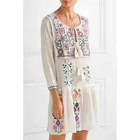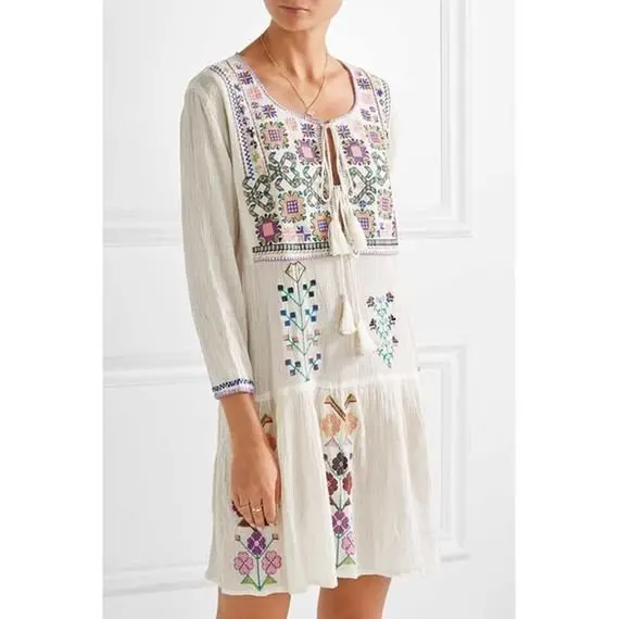 White short boho dress/tunic featuring a long sleeve silhouette, a U-neck, a tasselled sash belt, and an embroidered motif.