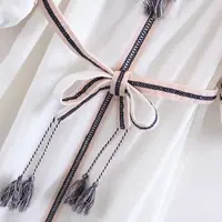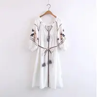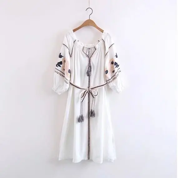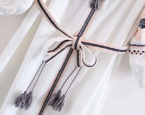 White short boho dress/tunic featuring long puff sleeve silhouette, a U-neck, a tasselled belt, and an embroidered motif.