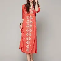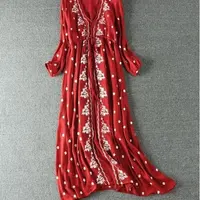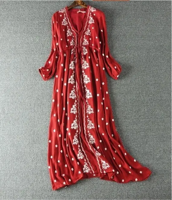 Red long boho dress/tunic featuring a long sleeve silhouette, a U-neck, and an embroidered motif. It is a dress which I made for myself, wore it for a while, but as it does not fit anymore, offering for sale for someone else to enjoy ! Very good condition !