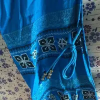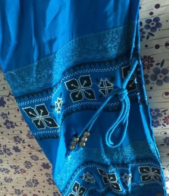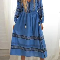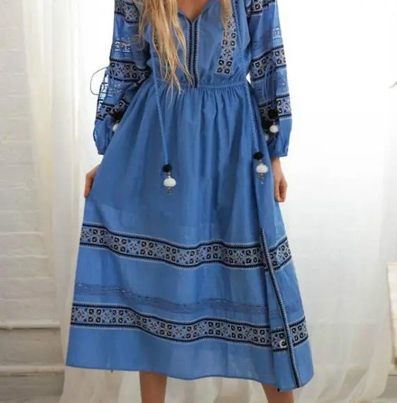 Blue long boho dress featuring a long sleeve silhouette, a U-neck, a tasseled belt, and an embroidered motif.