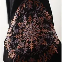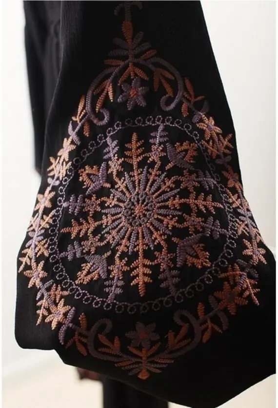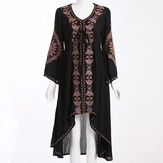 Long high low hem black boho dress, U neck, long wide sleeves, a tasseled belt, and an embroidered motif.