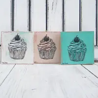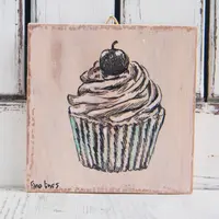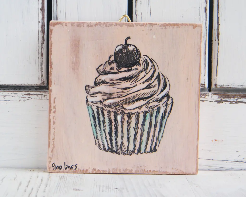 This cute cupcakes print is handmade with love: the original illustration is transferred on to a hand painted and sanded wood sign to create unique black and white art work.