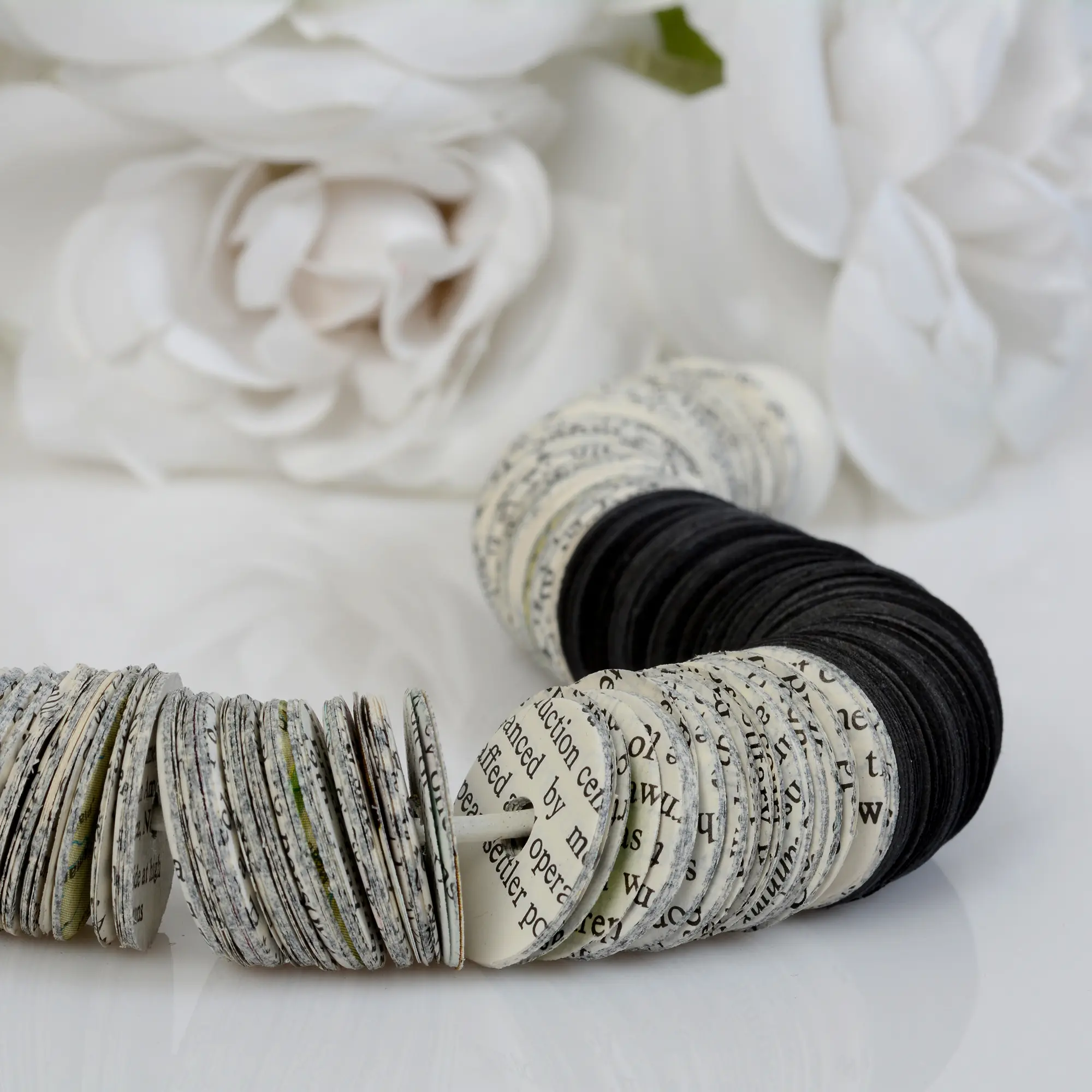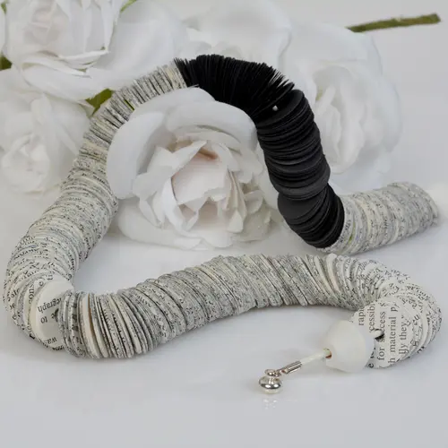 This asymmetric statement necklace is made of hundreds of book papers, cut in a circle shape, combined with black and book paper discs of 3/4" and black beads. This light weight and elegant necklace is threaded in a 21.6 inches (55 cm) leather cord with a magnetic clasp. Make a statement with this unique necklace! Ecological, original, super light, cheerful and colorful! The necklaces may have a variations of colors because of the paper and the books Texture. CARE To keep your paper necklace as beautiful as new, I suggest to avoid contact with perfumes and water. It is not waterproof. PACKAGING All jewelry items will arrive packaged in a beautiful box . Colors Color changes may occur. Book colors vary according to the age of the book. The colored pages vary depending on their production - there can be nuances close to the color shown in the image. Please feel free to consult me with any questions you have. I hope you enjoy looking through my shop and enjoy the necklaces as I do.