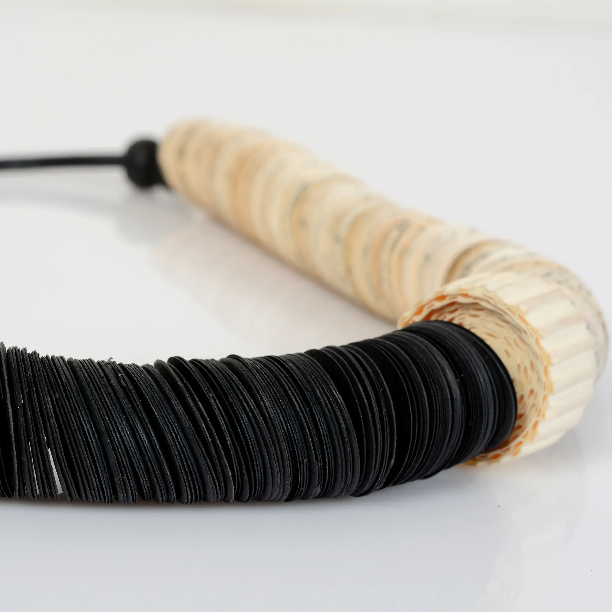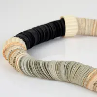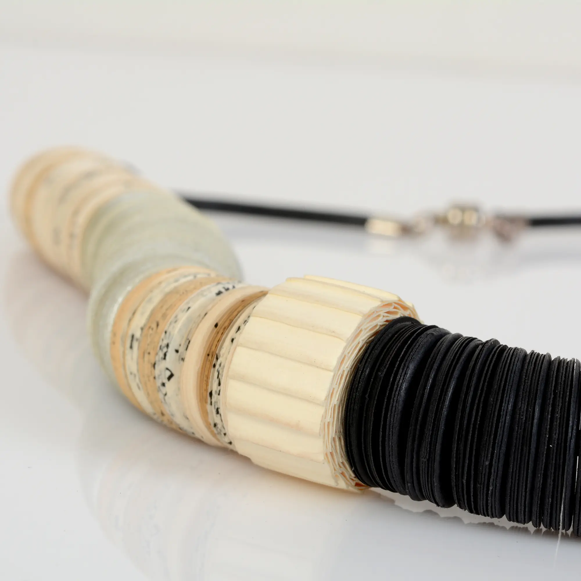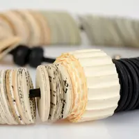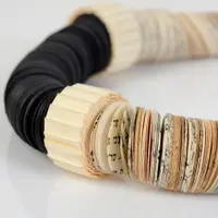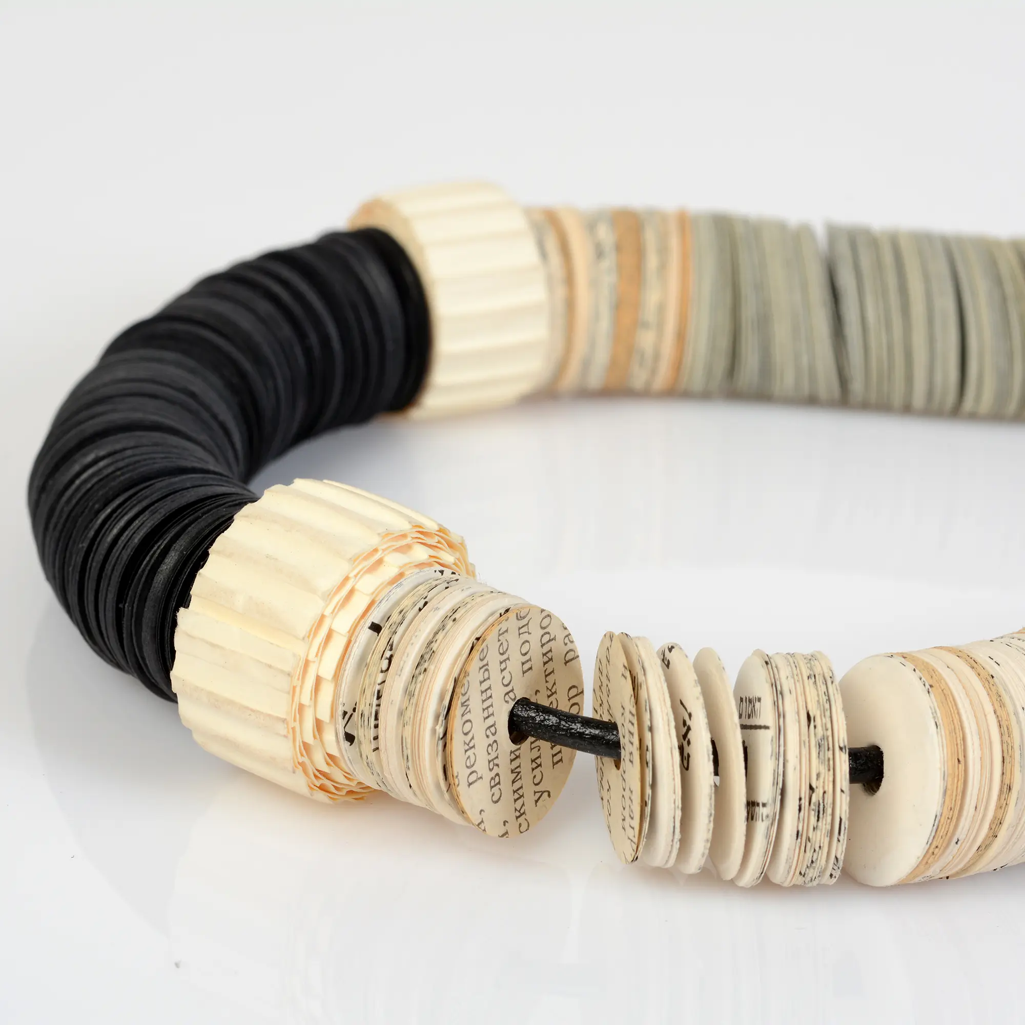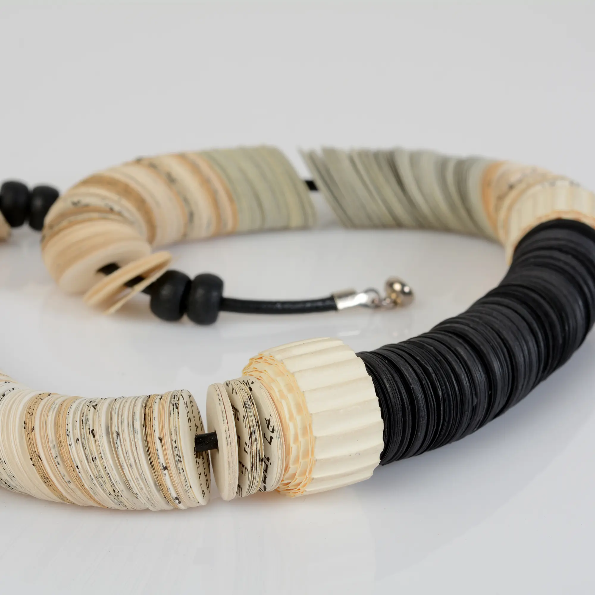 This asymmetric statement necklace is made of hundreds of book papers, cut in a circle shape, combined with black Gray and book paper discs of 3/4" and cutagaeted beads.
