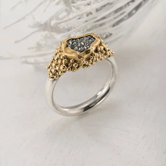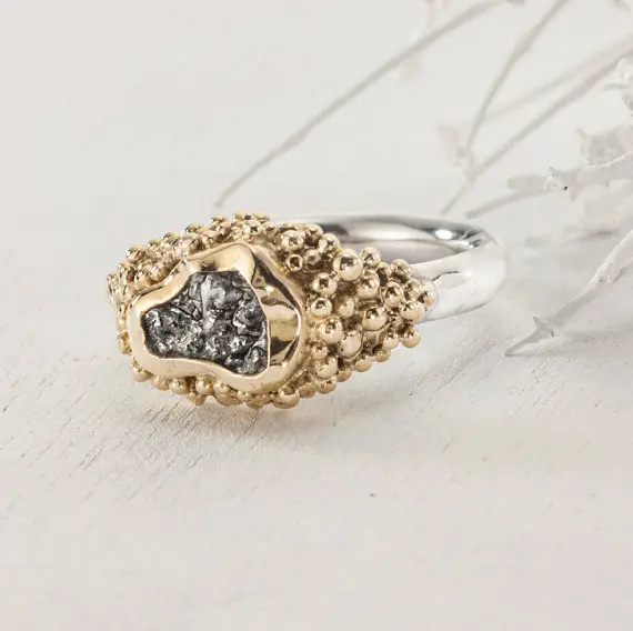 The small balls, dispersed all around the rough diamond, give it an antique and unusual look.