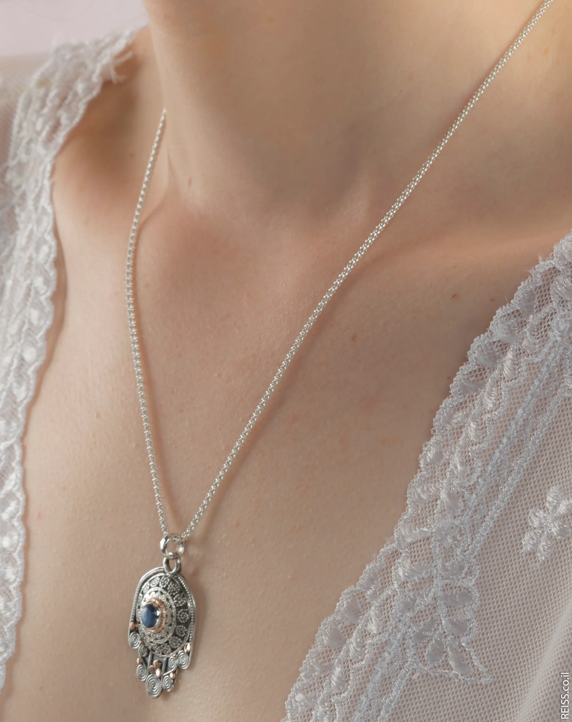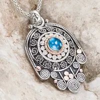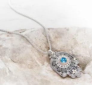 This hamsa necklace is made of sterling silver and 14k solid gold. A beautiful Blue Topaz stone sits in a sterling silver bezel surrounded by 14k red gold ring, hammered balls and silver filigree work. The pendant has been oxidized and polished to a high shine.