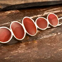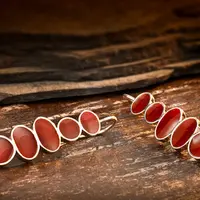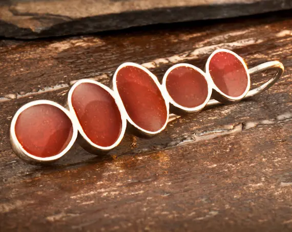 These light sterling silver hanging earrings are made of five different sizes of a sterling silver bezel set and resin. The pretty shade of the shiny red color, gives a blip of color to the face. This red color could be described as dark carnelian and it is similar to the color you see in the image.