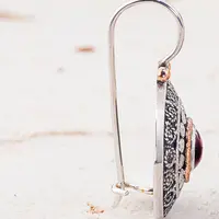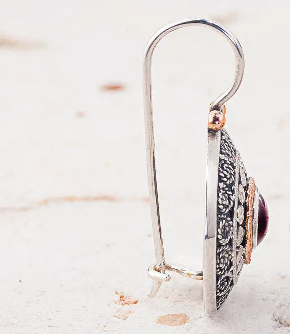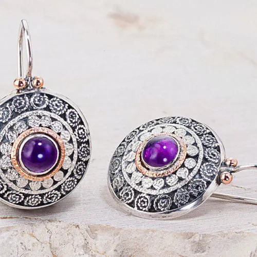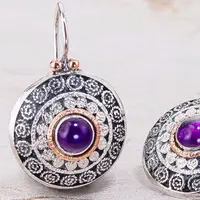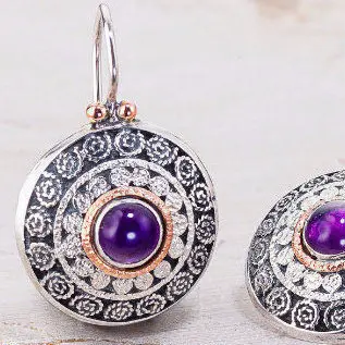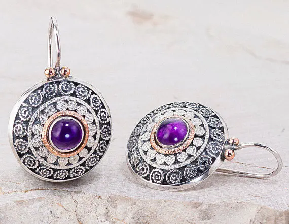 This is round filigree pair of earrings, made from sterling silver, inset with Amethyst gemstone. The stones decorated with 14k red gold ring and silver dots. The partly oxidized earrings with their ethnic design match everyday wear and special occasions as well.
