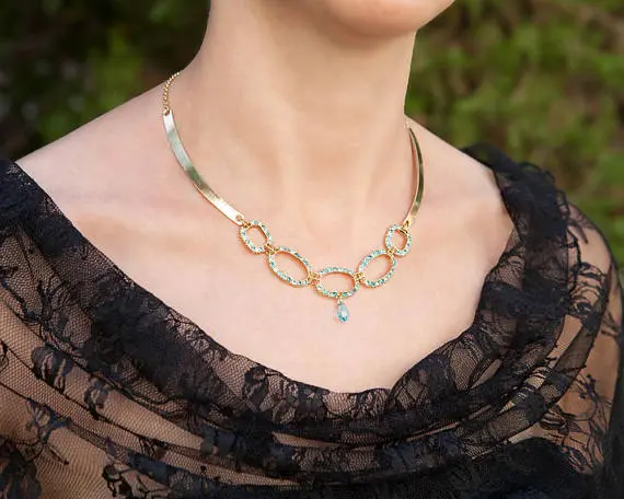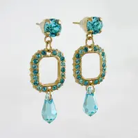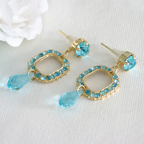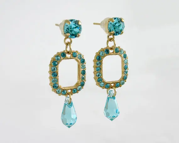 Earrings are made of 24k gold plated plated brass and adorned with light blue and turquoise Swarovski crystals.