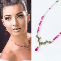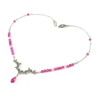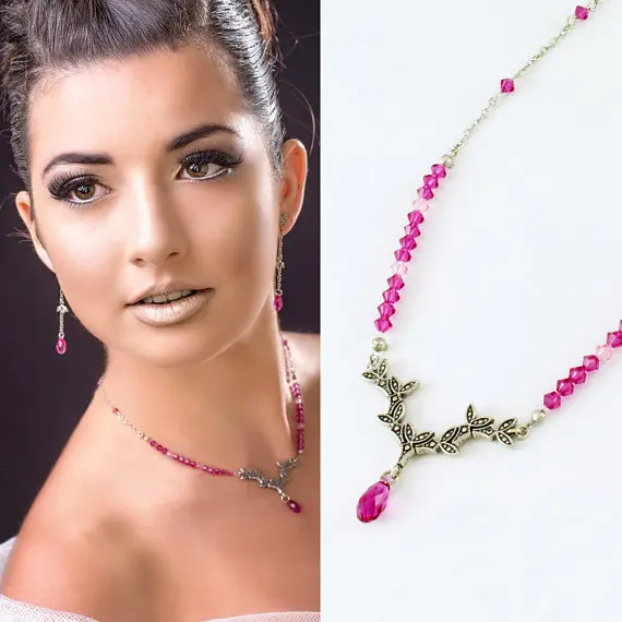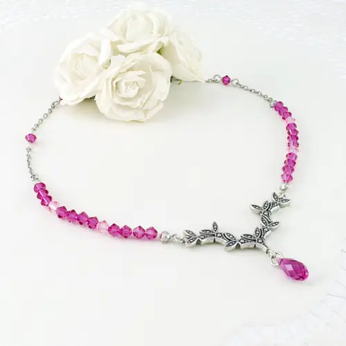 The necklace is made of antique silver plated brass with delicate leaf pendant and hot pink Swarovski crystals.