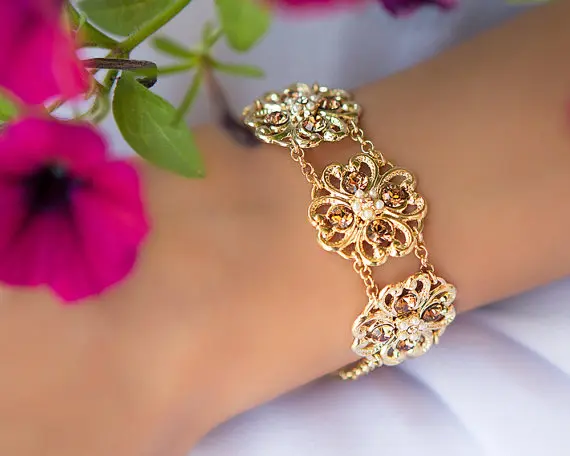 Beautiful Gold statement bracelet for special occasions and a special gift for mom, a woman that you love or for a bridal who is looking to use a Statement bridal bracelet.