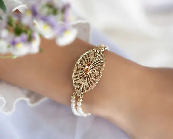 Gold filigree bracelet was made with a special combination of champagne crystals tones and little real pearls for romantic and soft feeling.