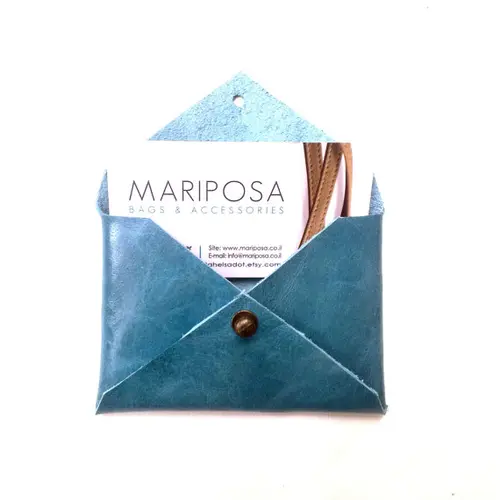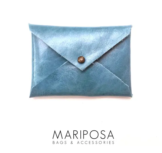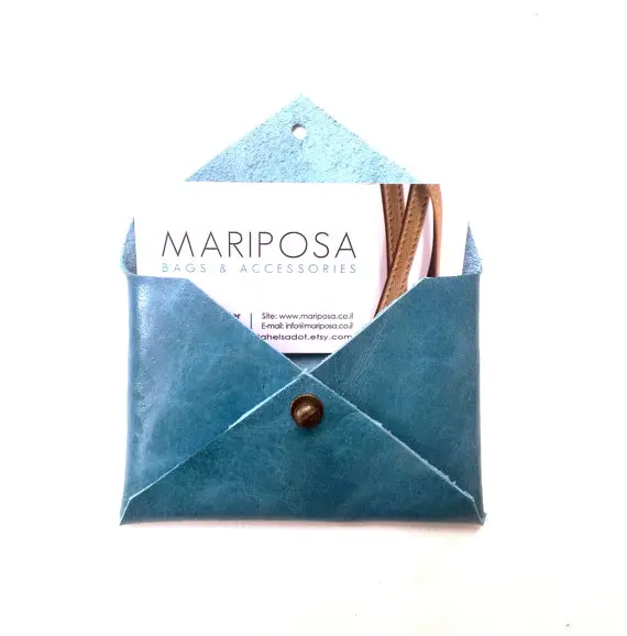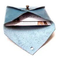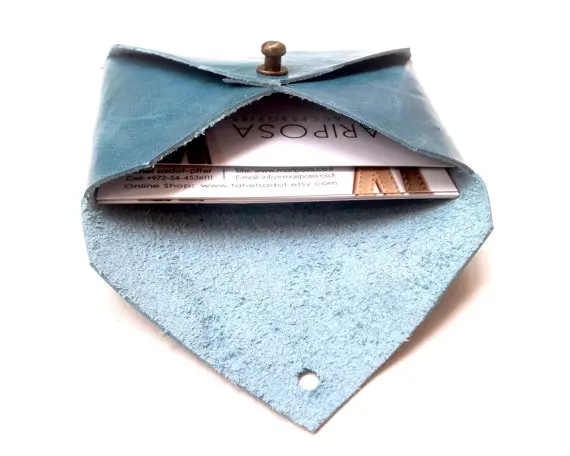The simple leather card case is of envelope design, suitable for all cards in general size.