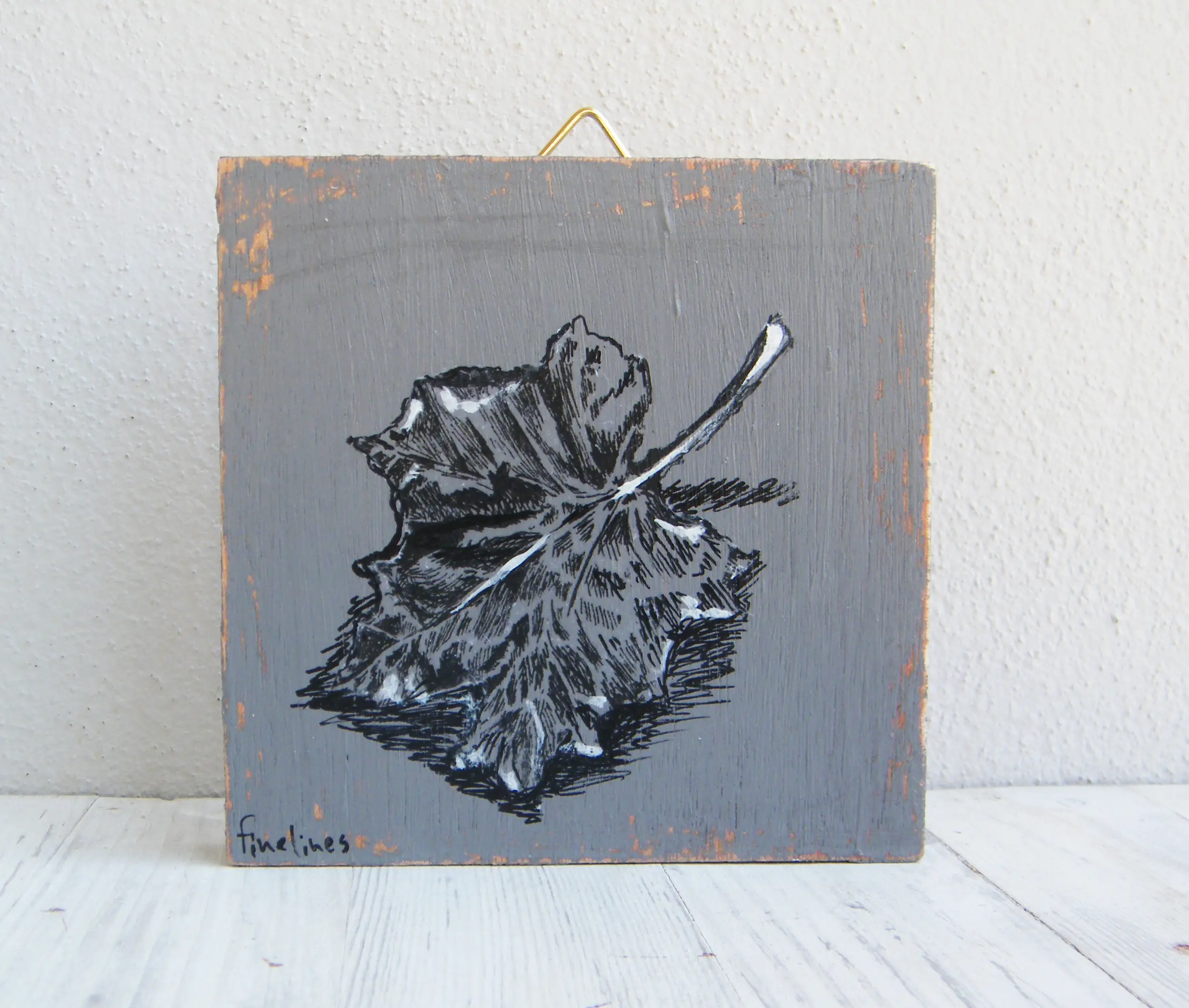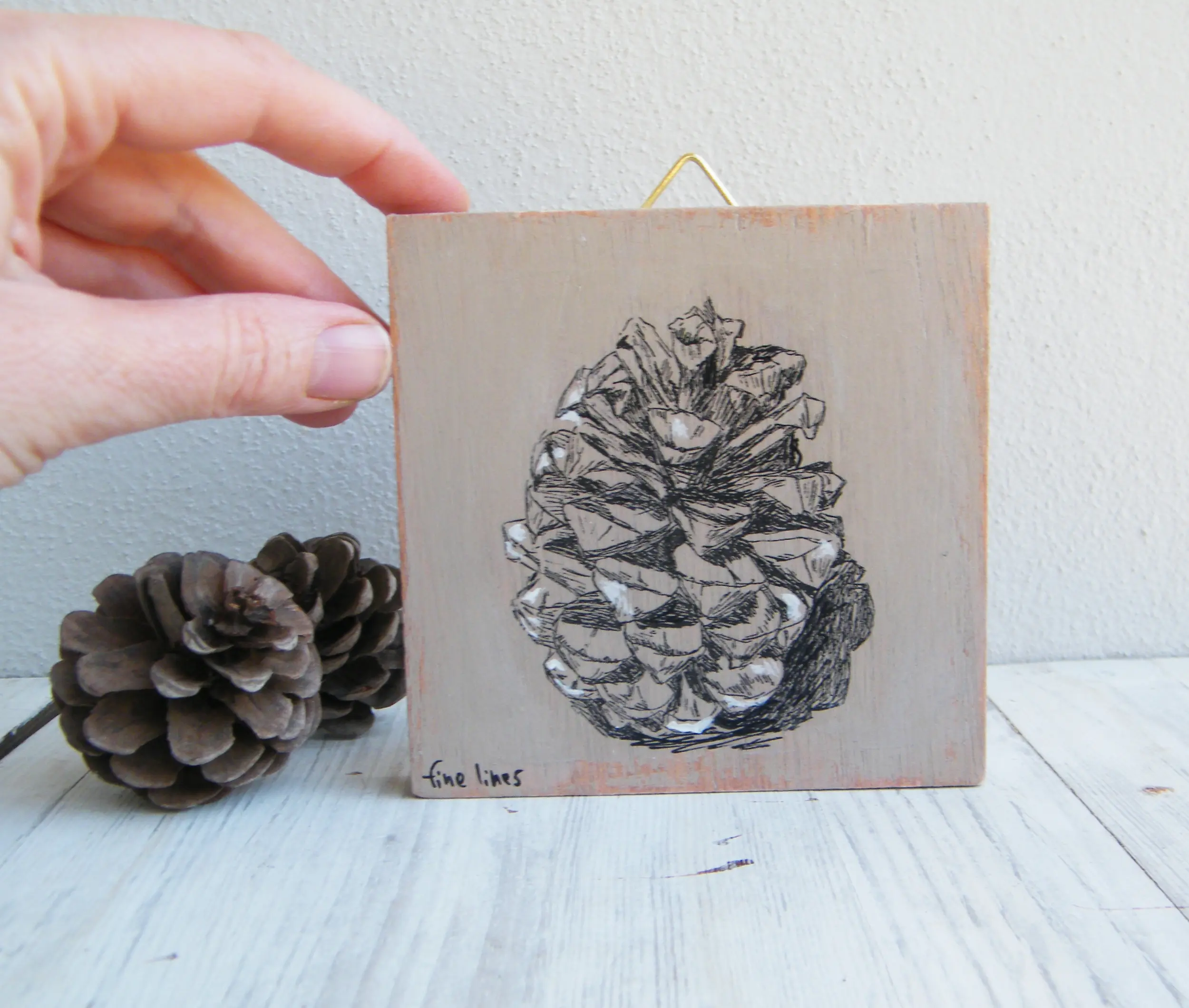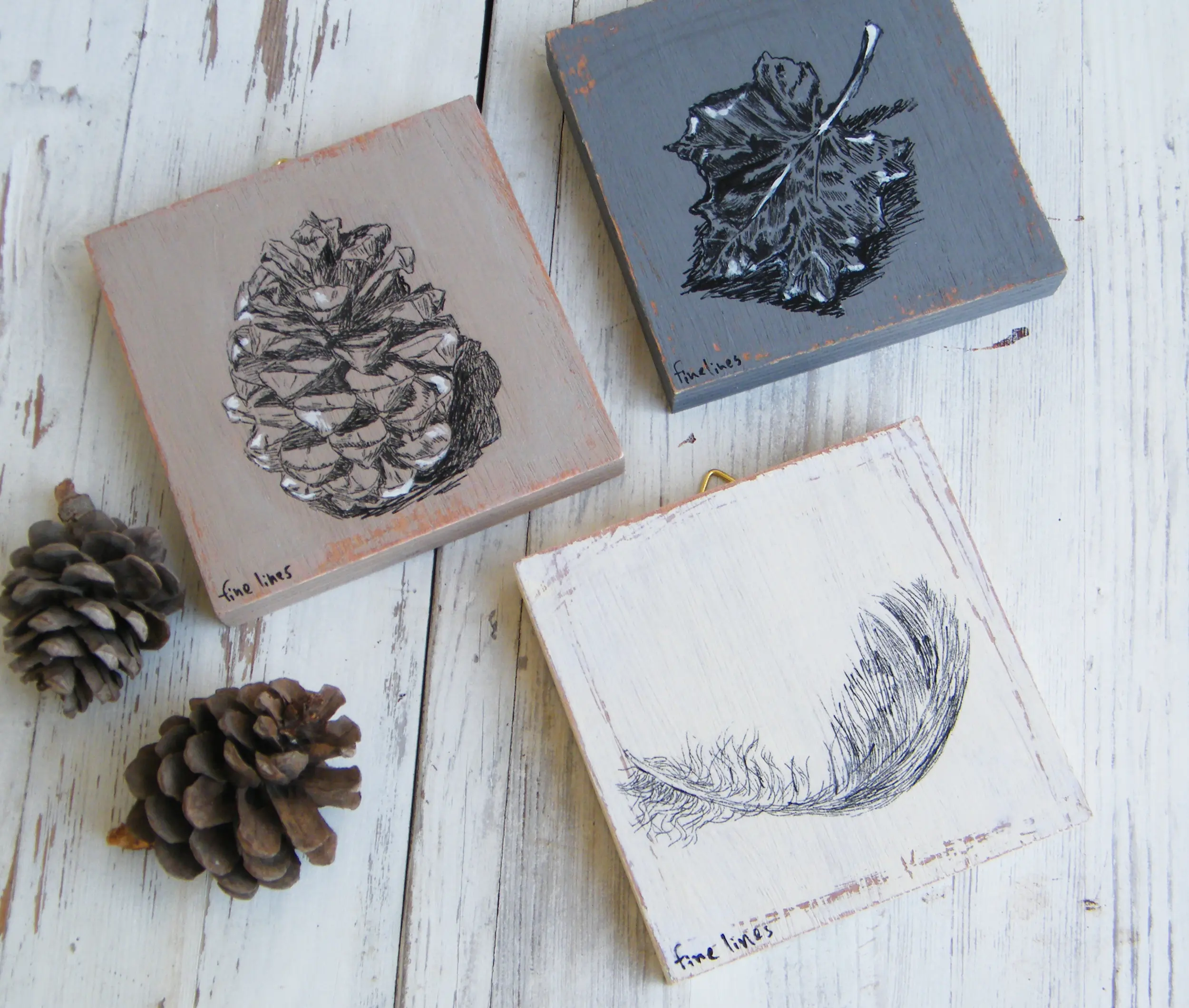 The illustrations are a hand painted, pen and ink sketch, and printed on the wood by hand.