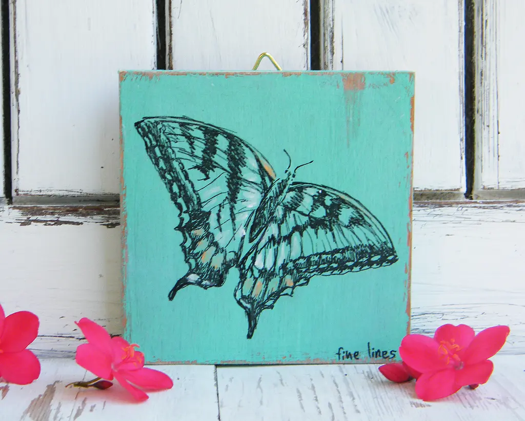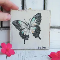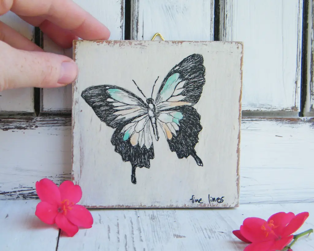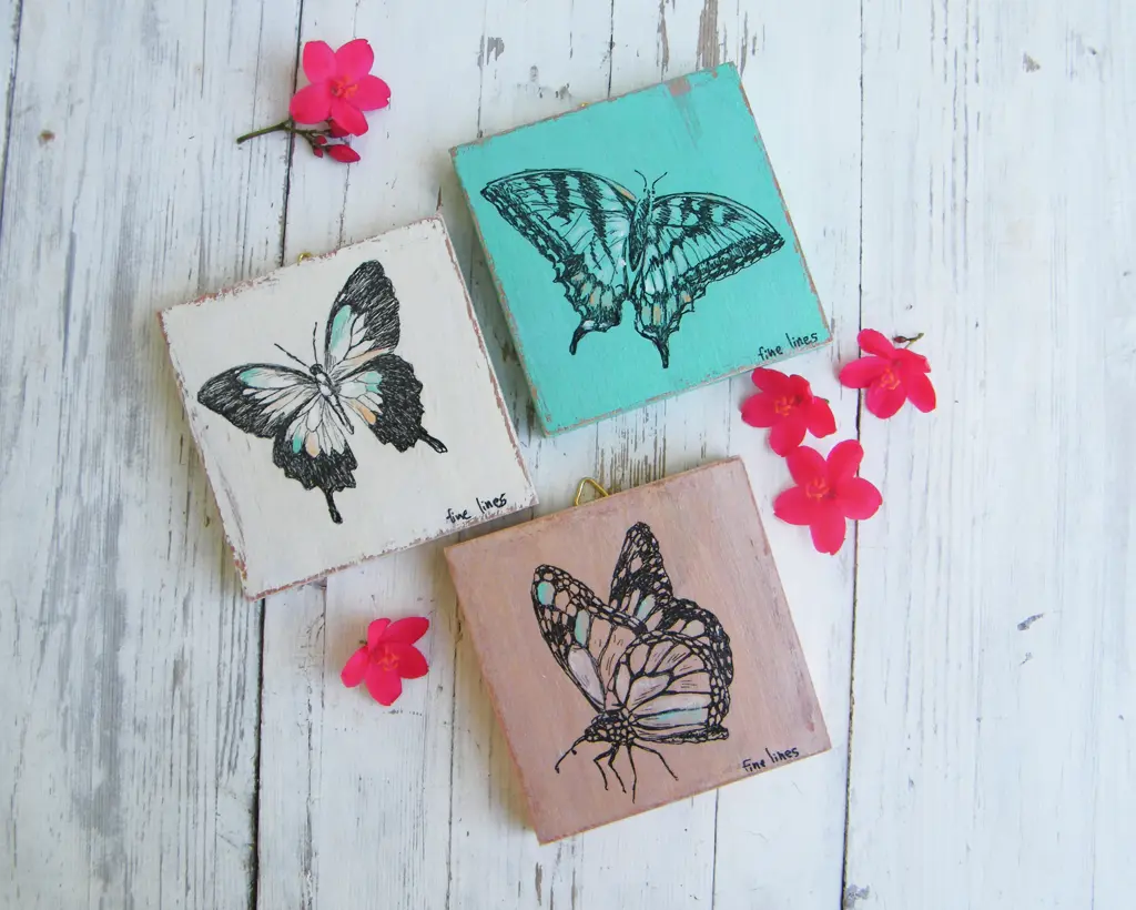 This wonderful natural prints set is handmade with love: the original illustrations are transferred on to a hand painted and sanded wood sign to create unique black and white art work.