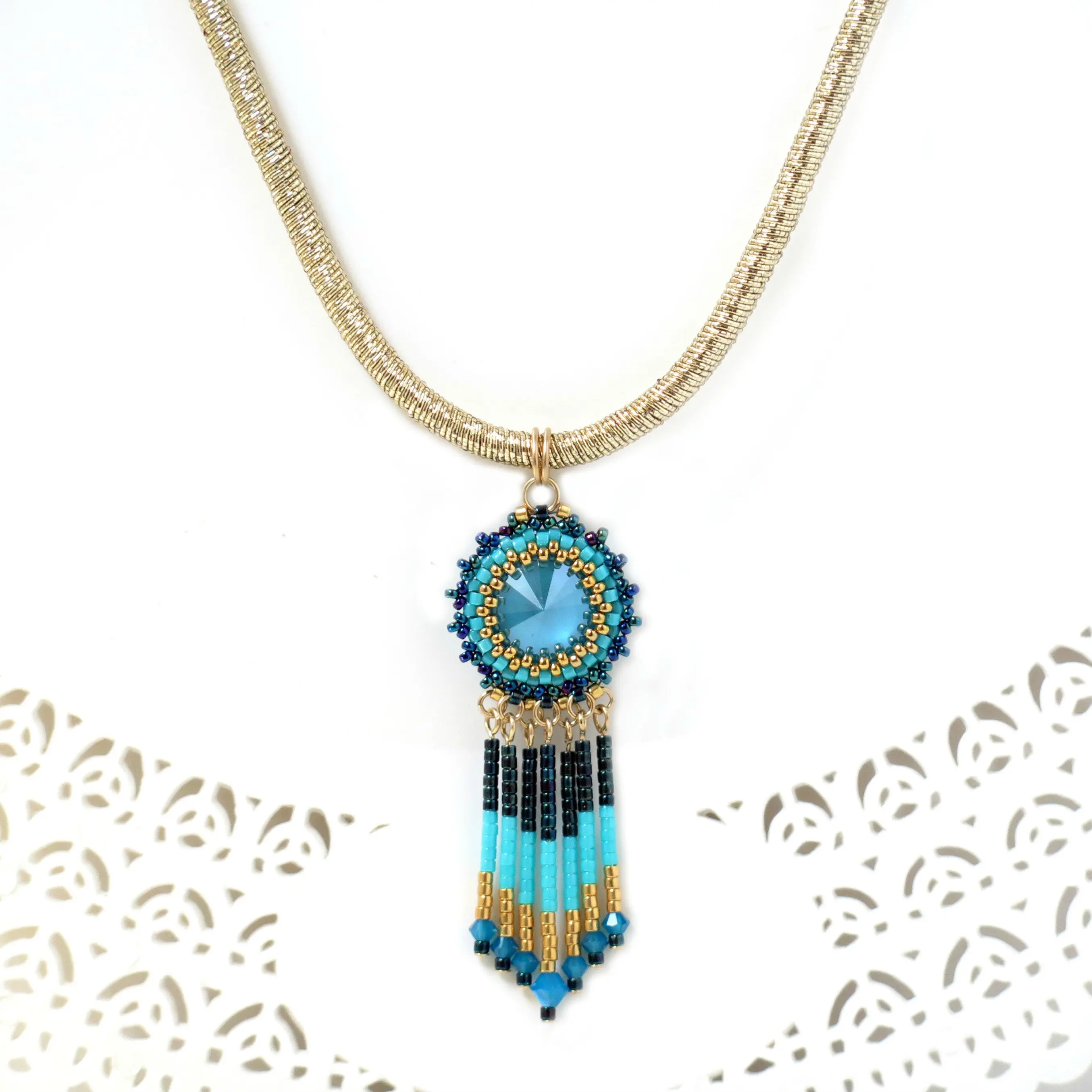 I created this Beaded tassel pendant necklace by hand, using Swarovski revoli 14mm, Swarovski beads 3-4mm, Miyuki round seed beads, Miyuki delica beads, 14k goldfilled fringe and lobster claw