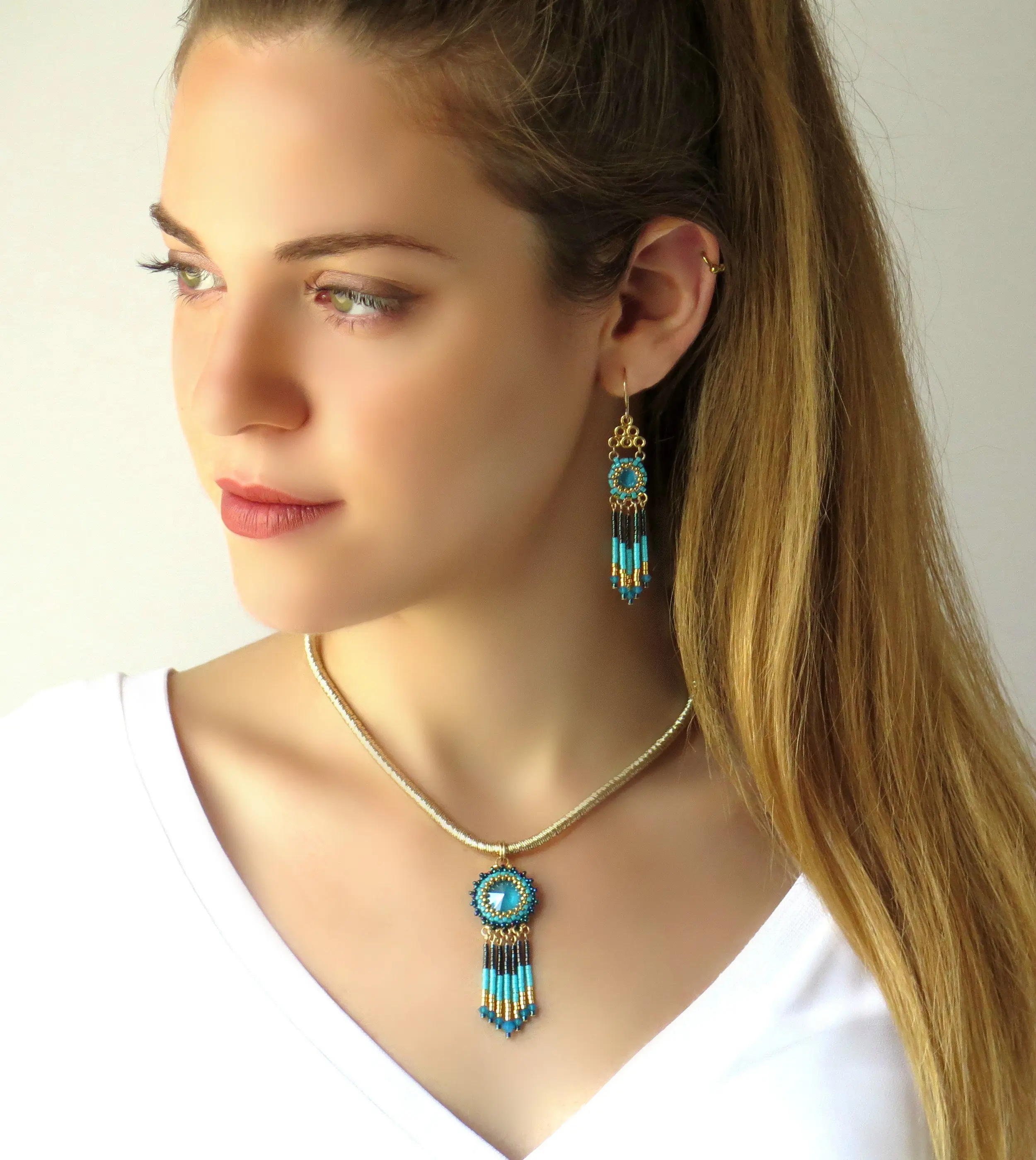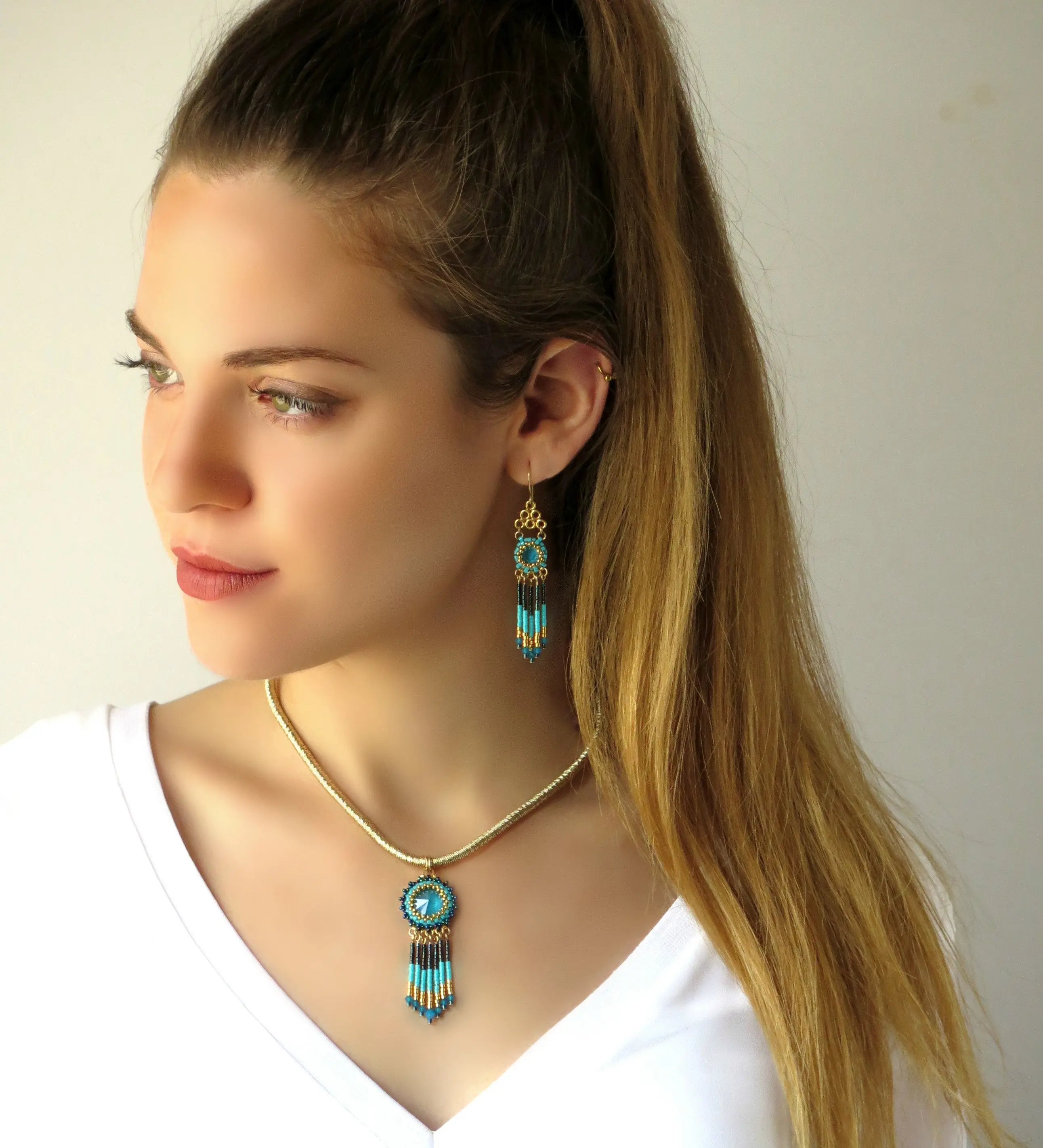 Turquoise and gold fringe necklace for women, Beaded tassel pendant necklace, Swarovski crystal boho chic necklace, Tribal style necklace