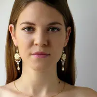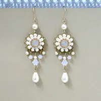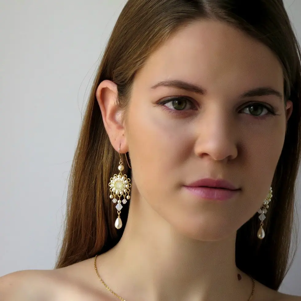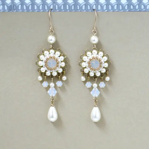 I created this wedding earrings by hand, using lacquer coated brass flowers, Swarovski rivoli 8mm, Swarovski pearls and beads 3-5mm, pearl drop, Miyuki round seed beads, Miyuki Delica beads and 14k goldfilled ear-wire