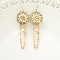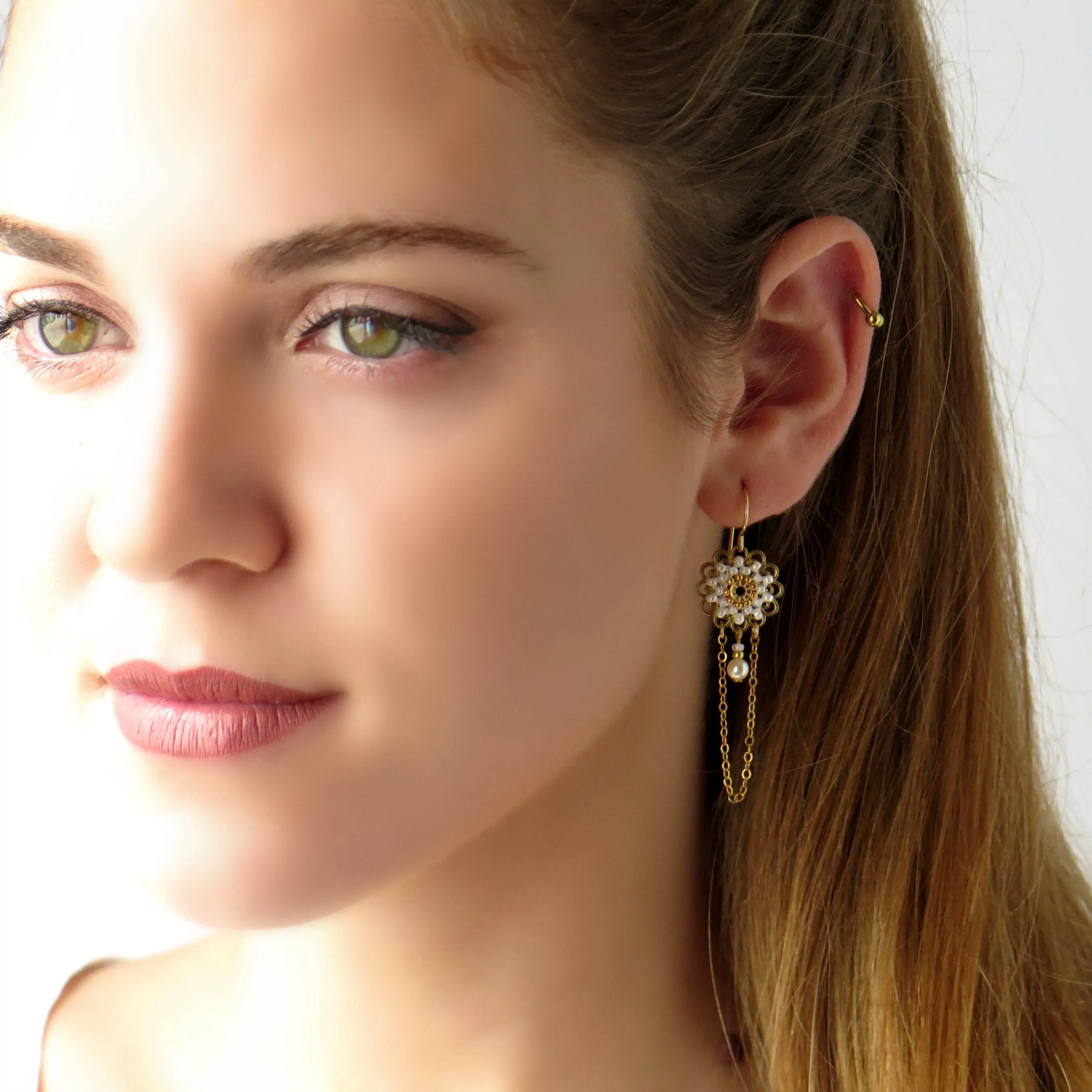 I created this delicate bridal earrings by hand, using lacquer coated brass flowers, Swarovski pearls 3-4mm, Miyuki round seed beads and 14k goldfilled chain and ear-wire