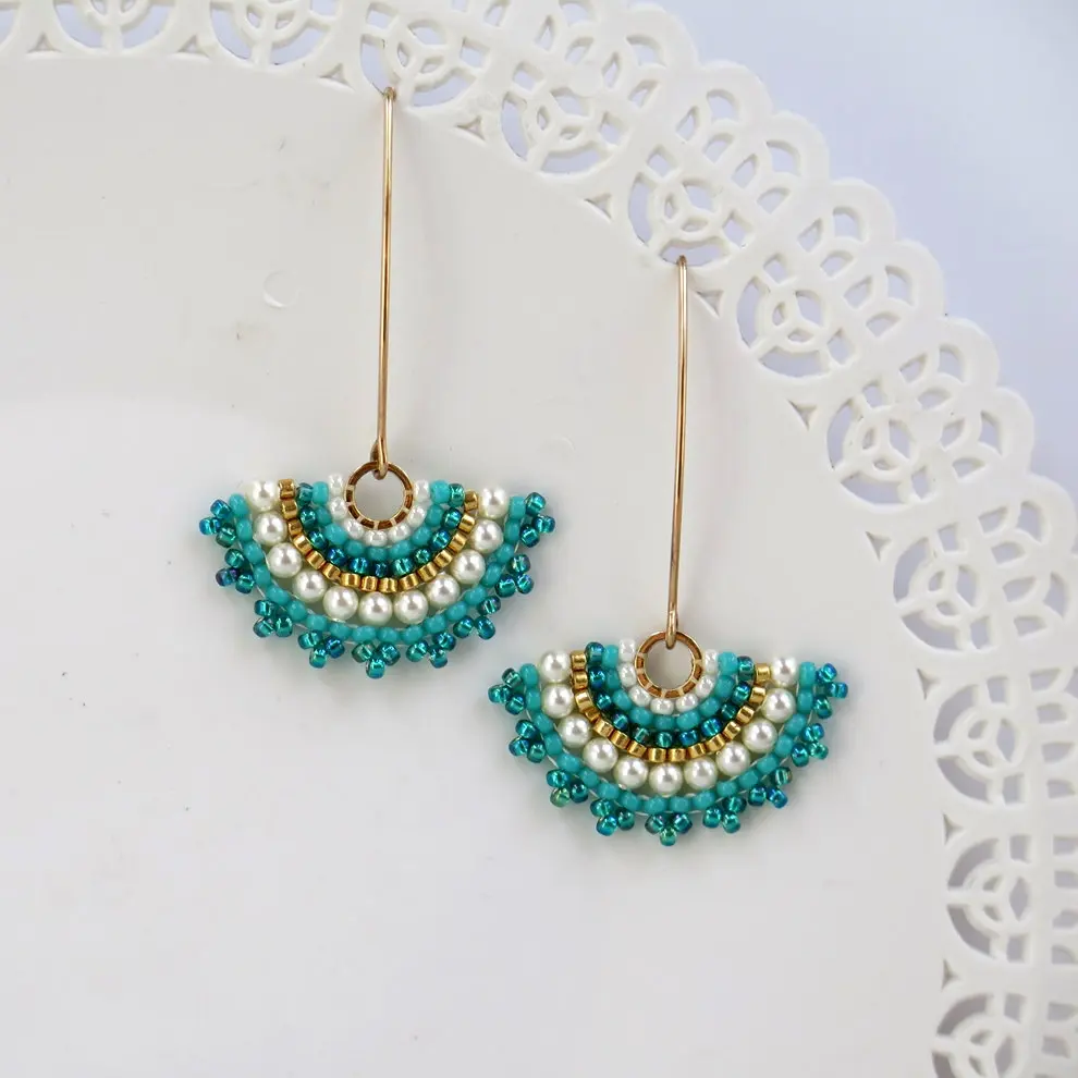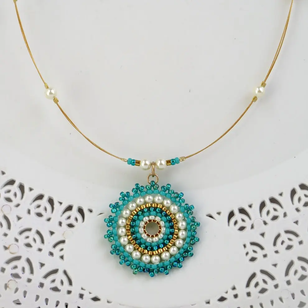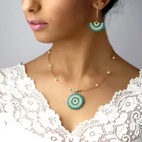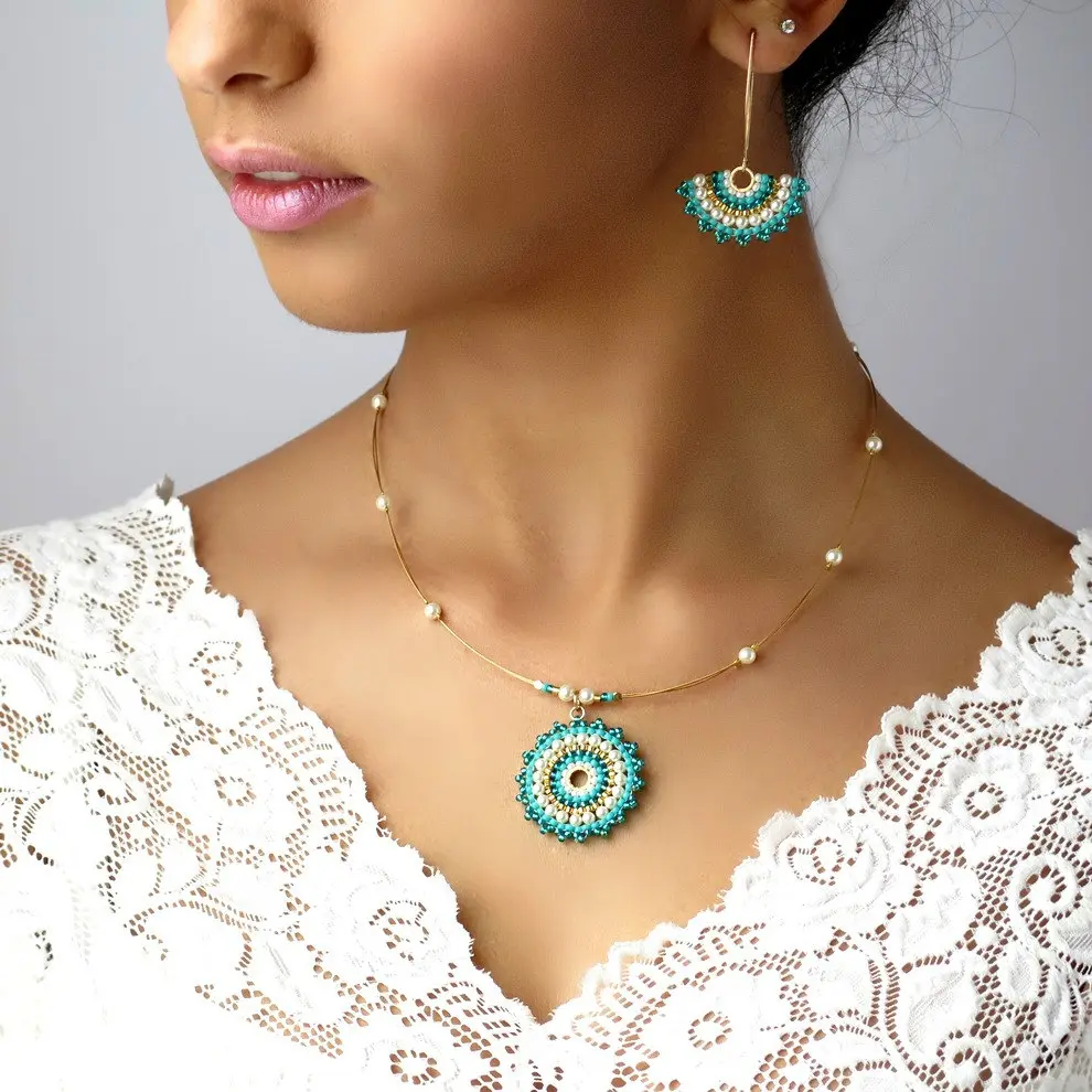 Turquoise and pearl Jewelry set, Gift for wife, Mandala turquoise gold necklace pendant, Boho chic necklace, Fan earrings, Beaded jewelry