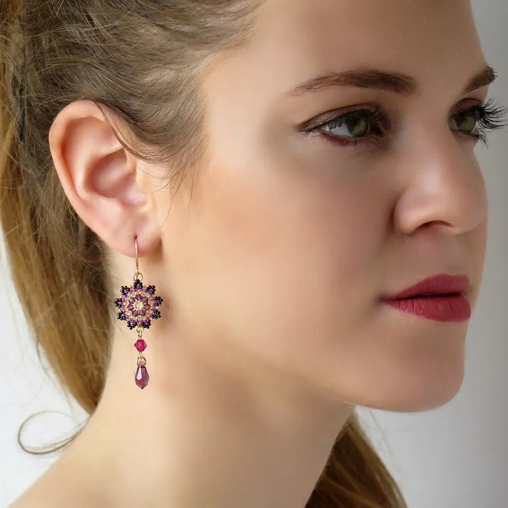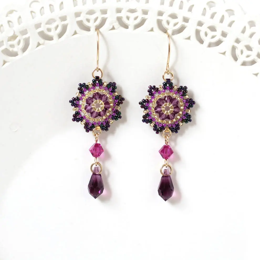 I created this purple dangle earrings by hand, using Swarovski beads 3-4mm, Swarovski drop, Miyuki round seed beads, Miyuki Delica beads and 14k goldfilled ear-wire
