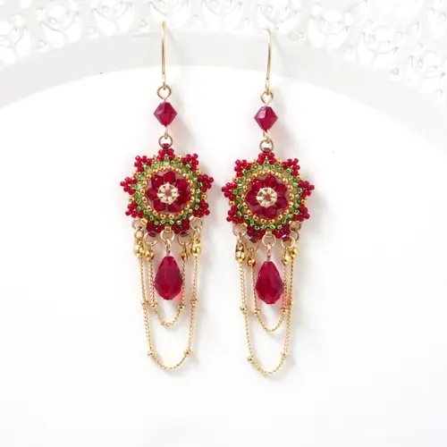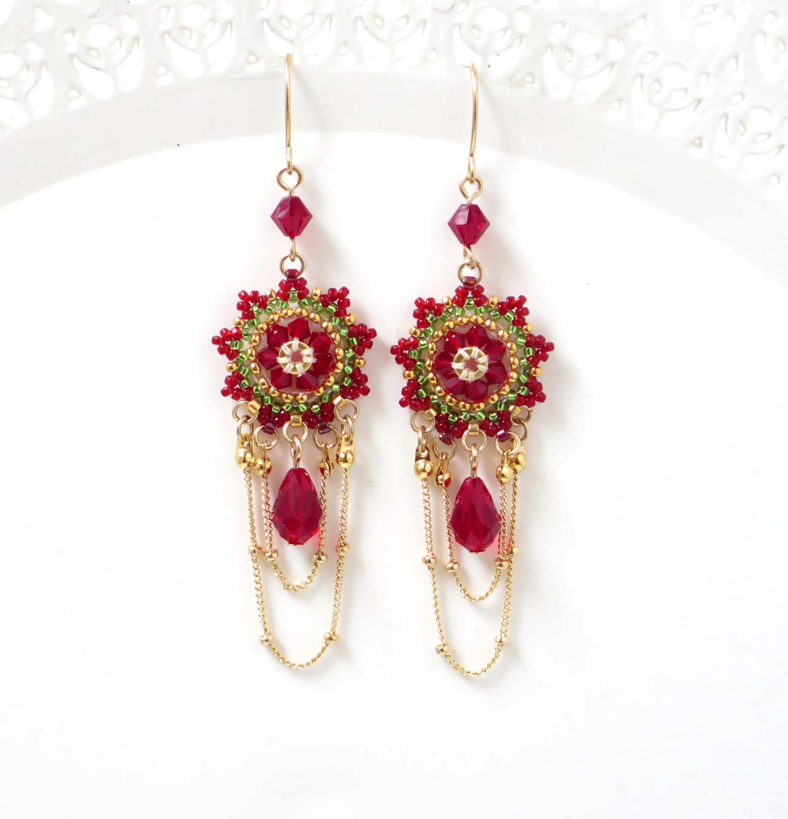 I created this statement earring by hand, using Swarovski 3mm beads, Swarovski drop, Miyuki round seed beads and goldfilled 14k ear-wire and chain.
