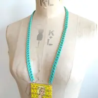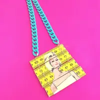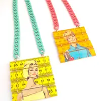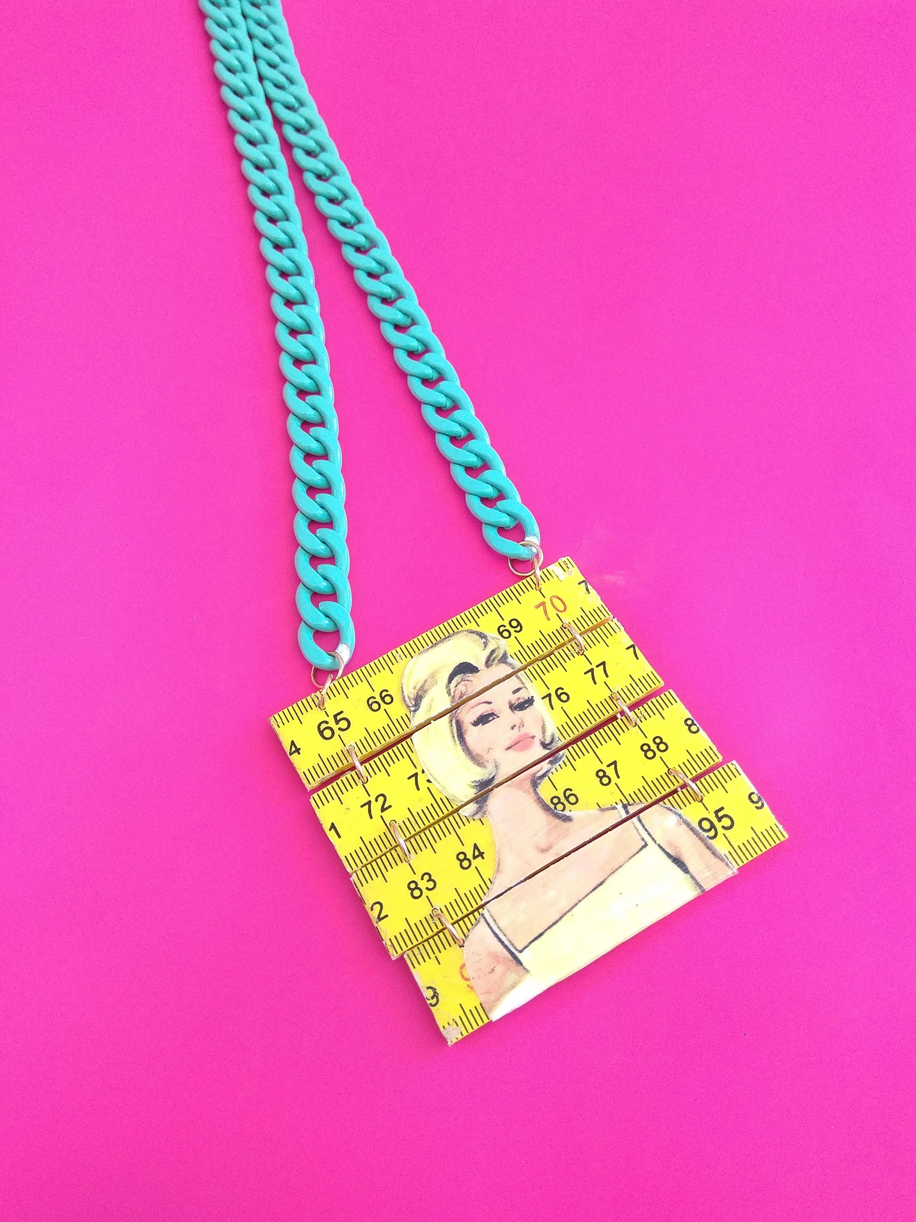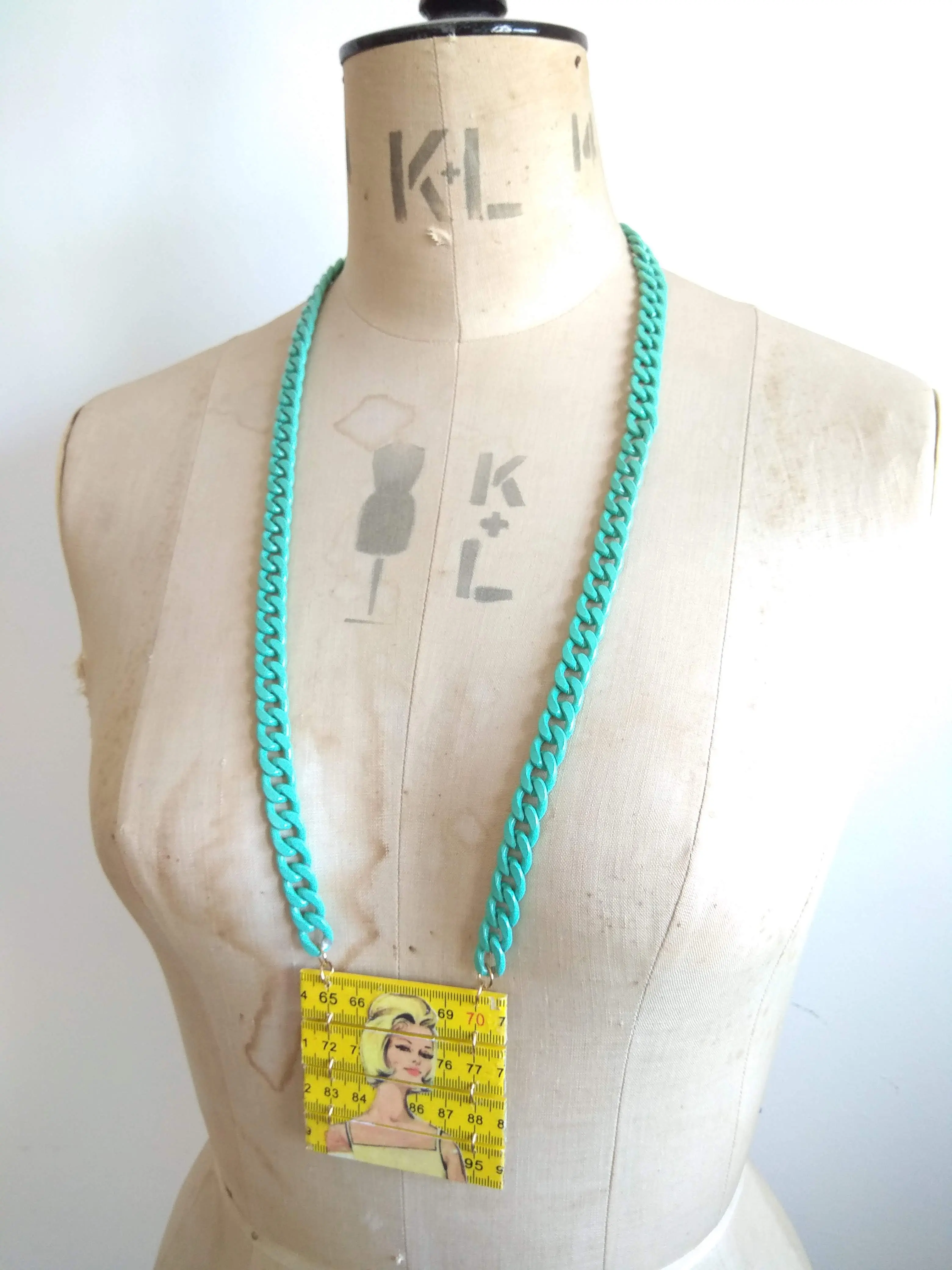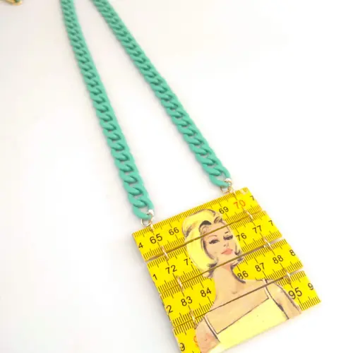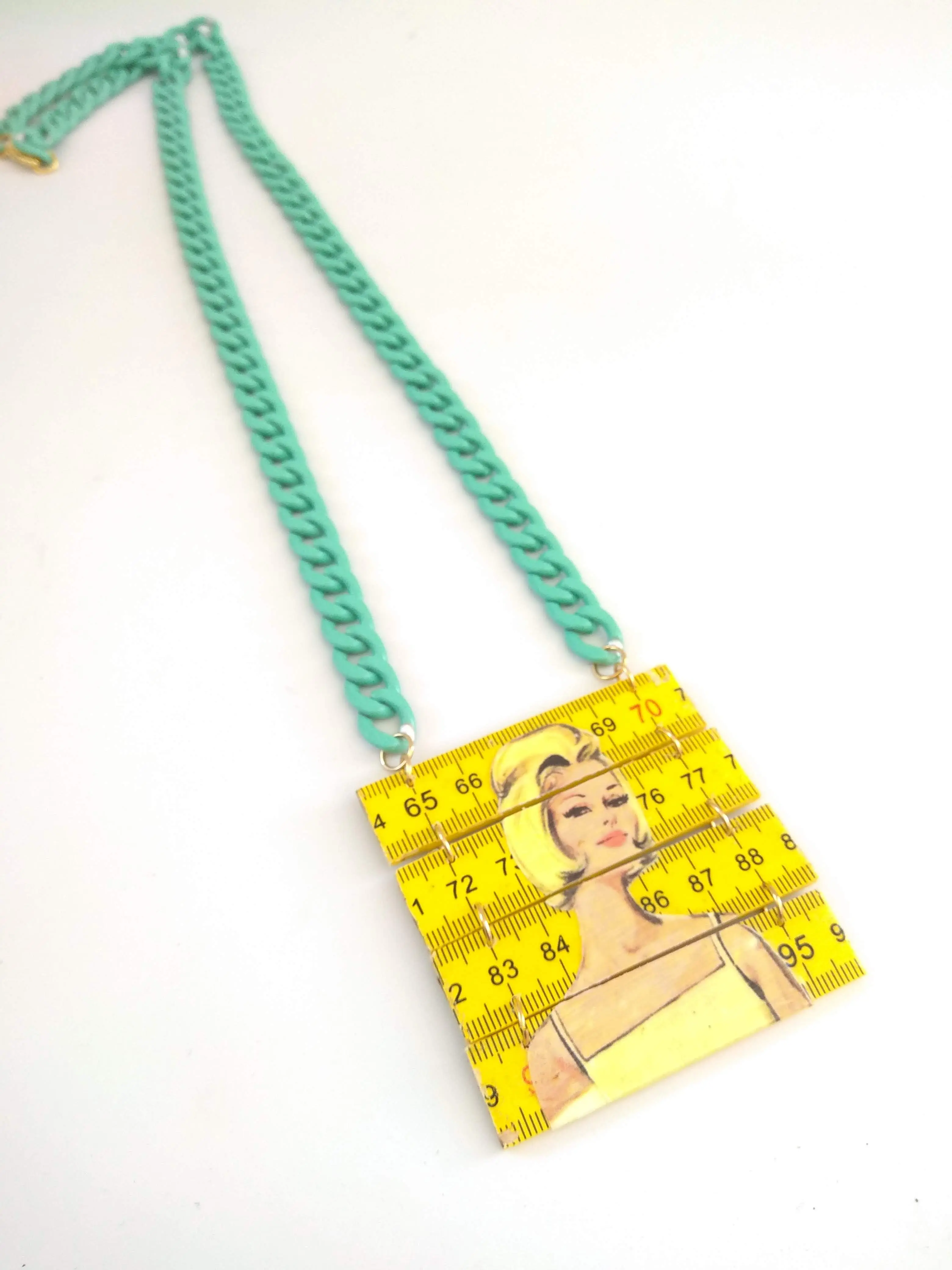 a statement necklace made from a yellow folding ruler with a woman figure from the 60's/