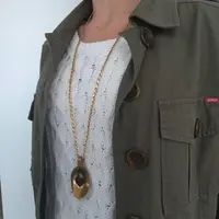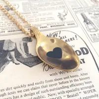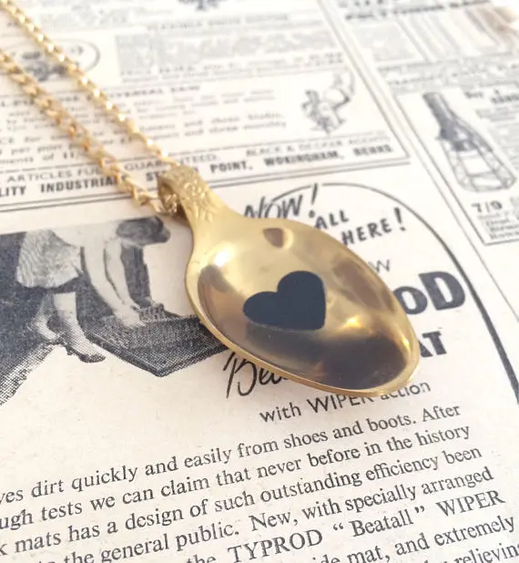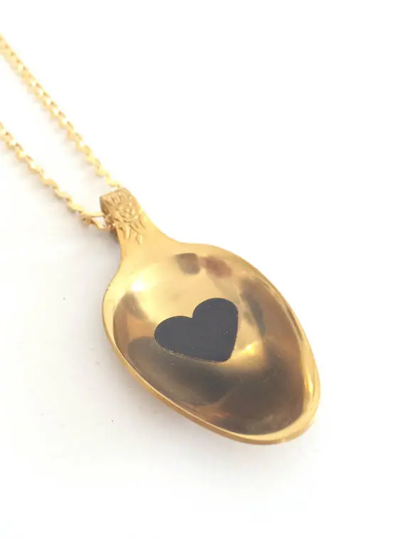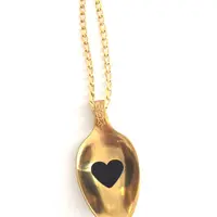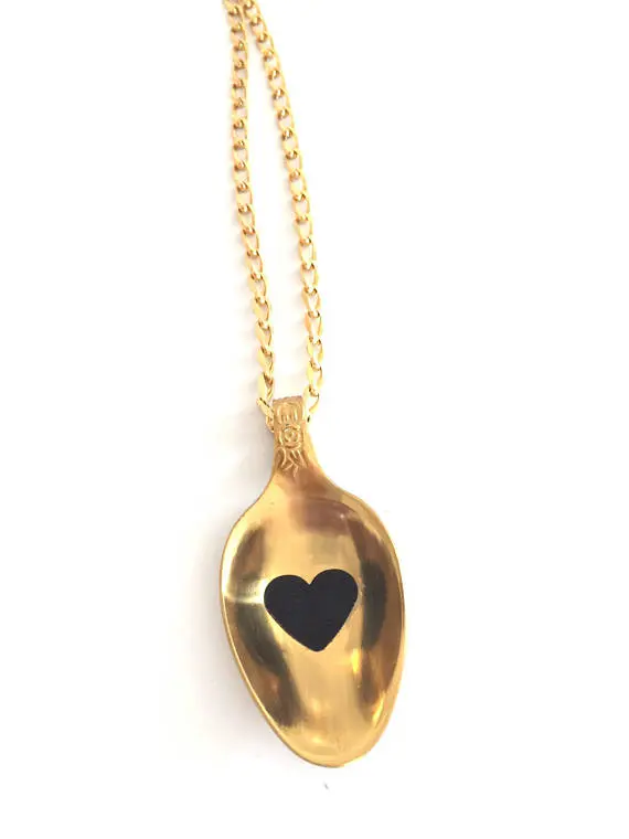 Unique golden teaspoon pendant with a black heart and a resin coat, vintage style.