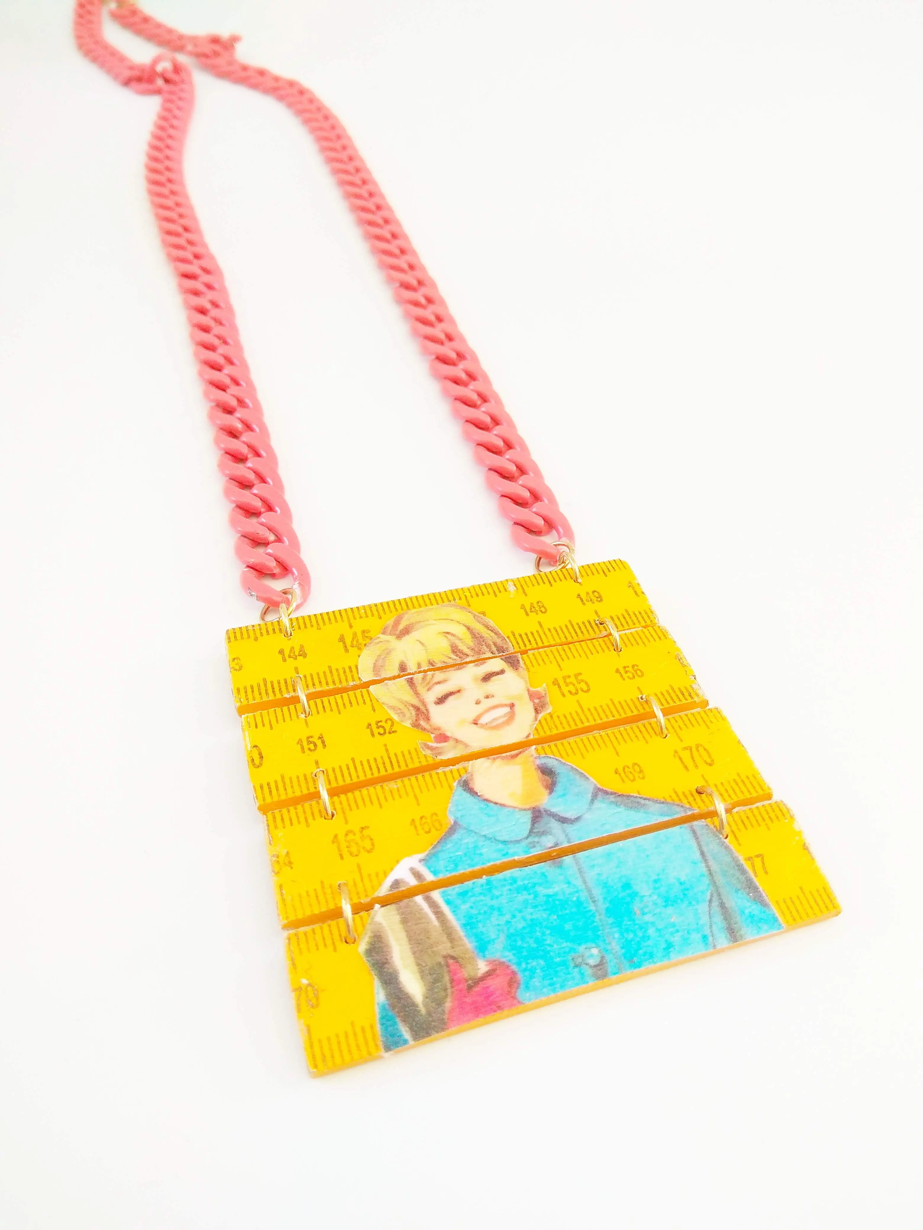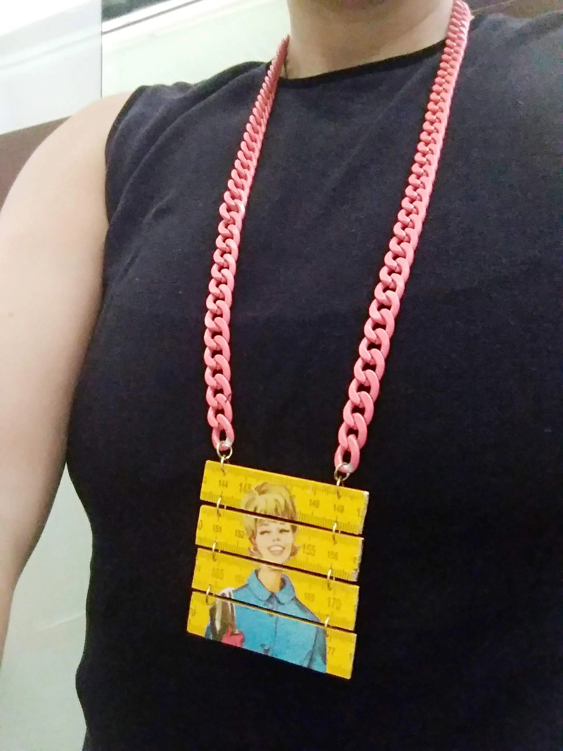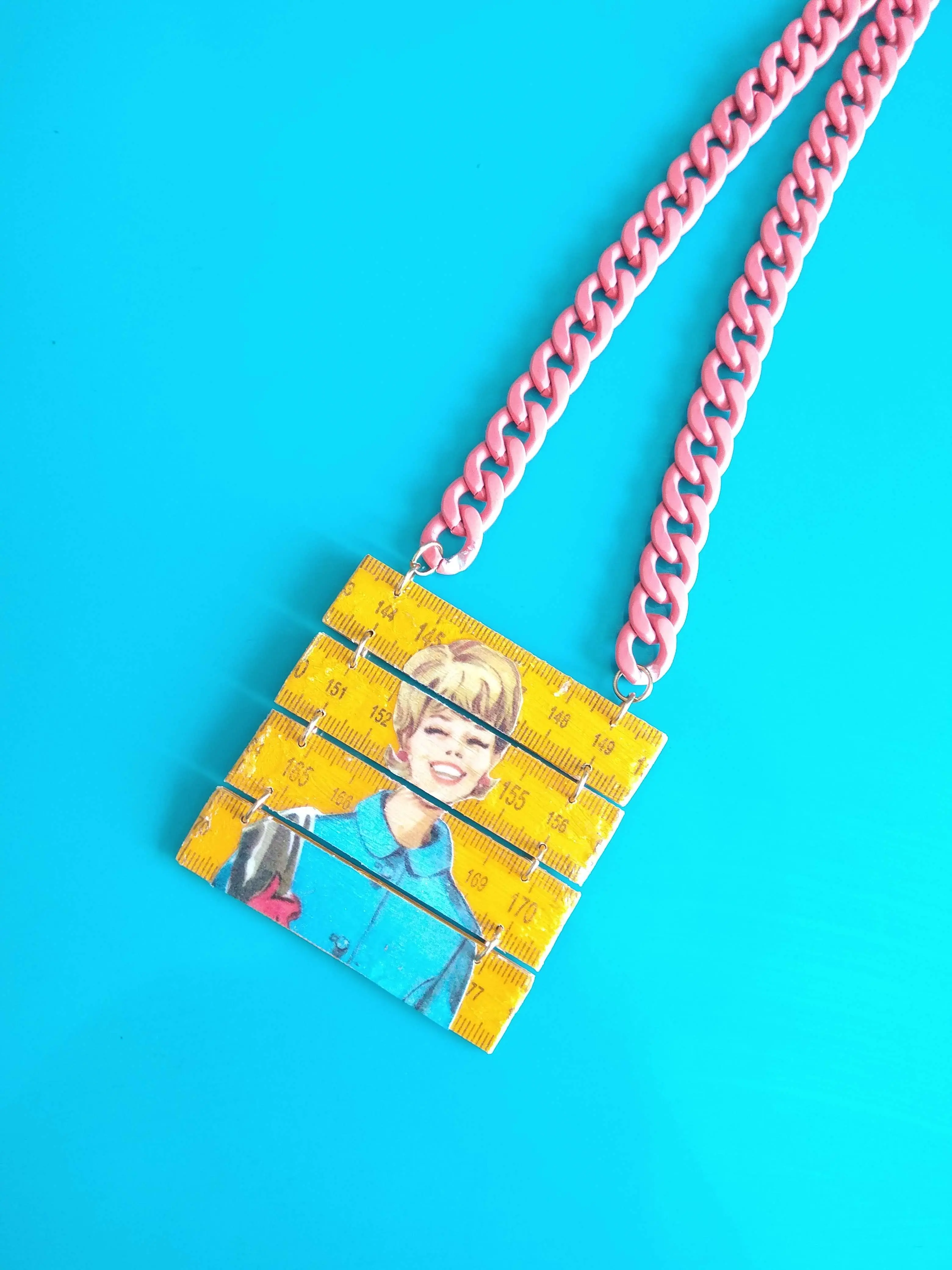 a statement necklace made from a yellow folding ruler with a woman figure from the 60's/