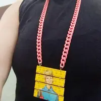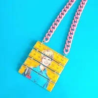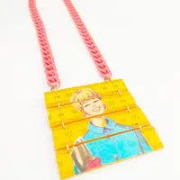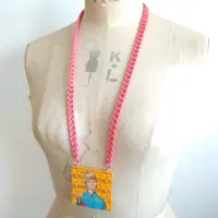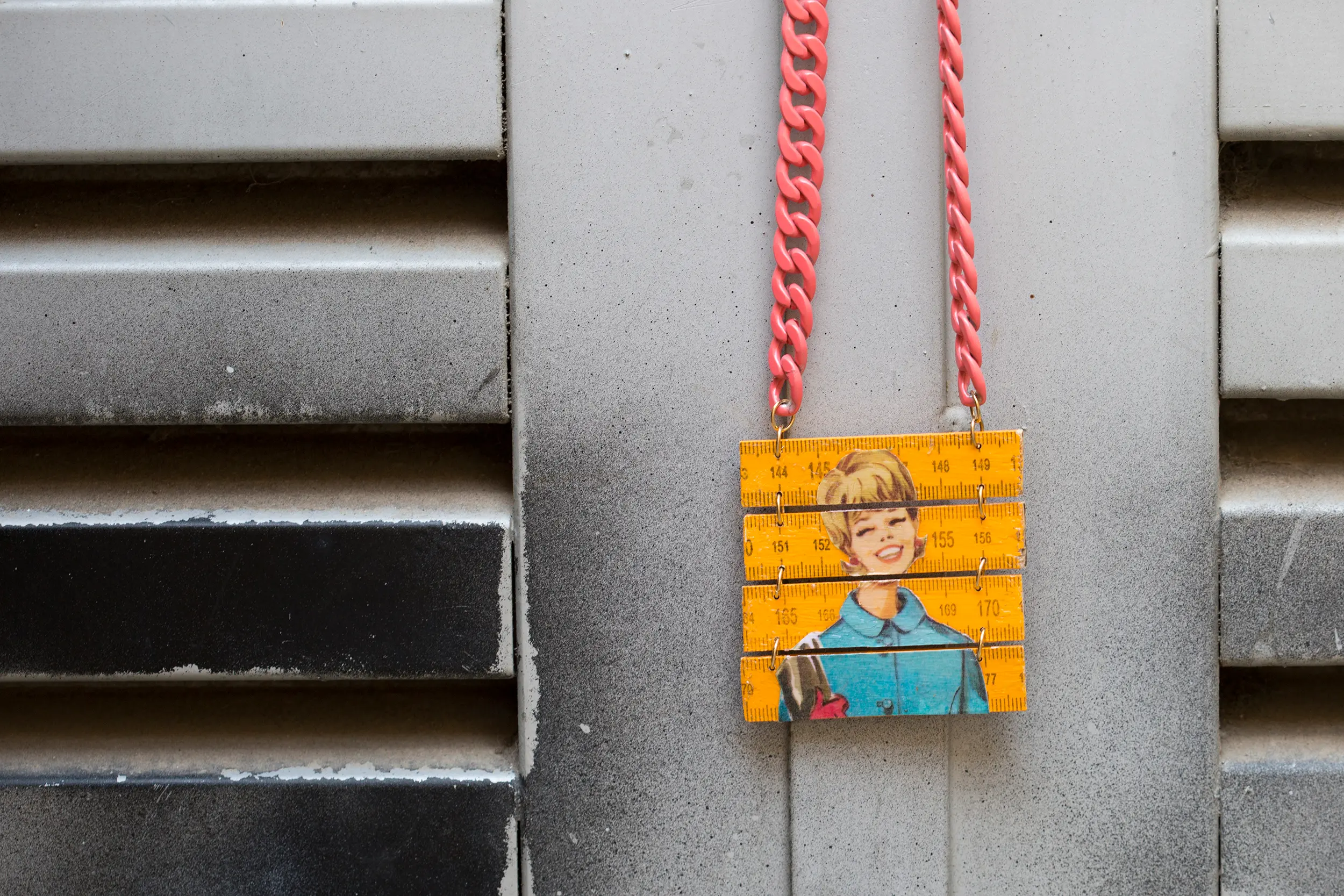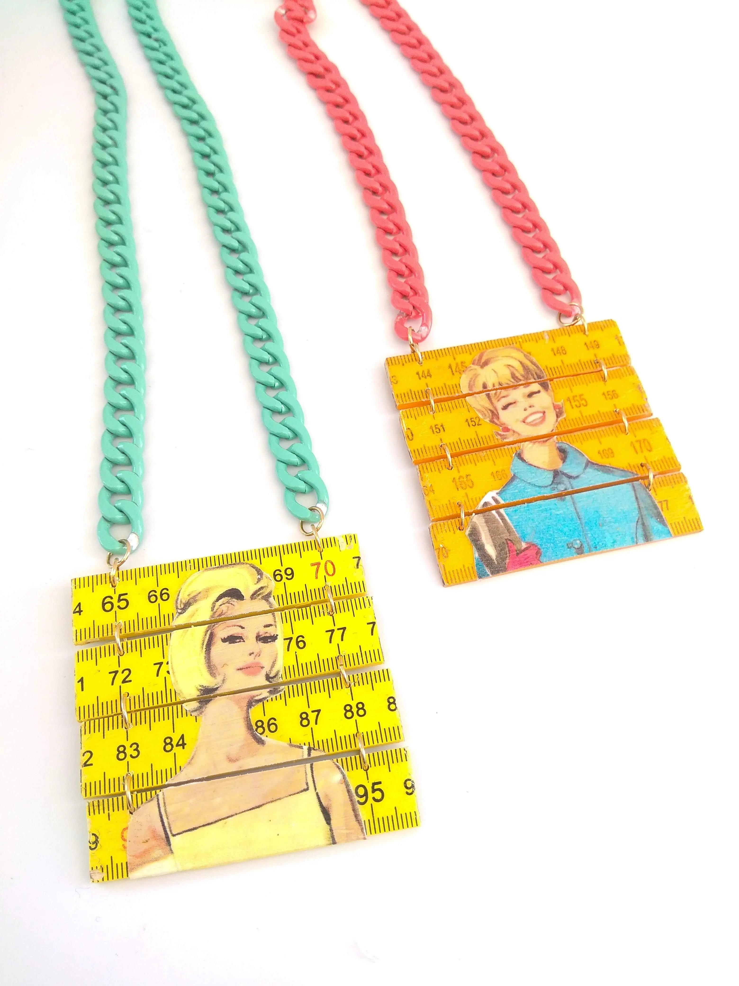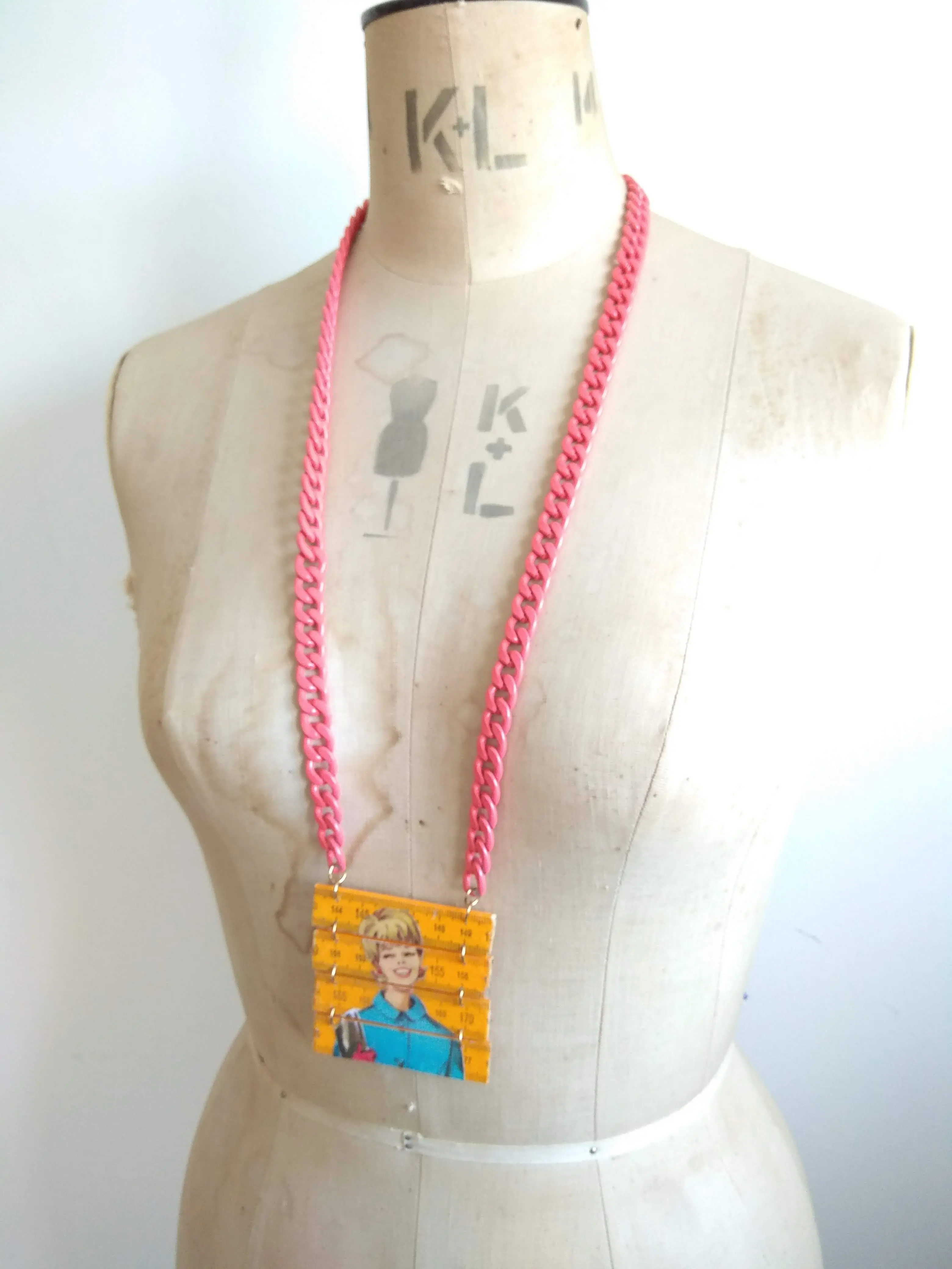 a statement necklace made from a yellow folding ruler with a woman figure from the 60's/