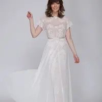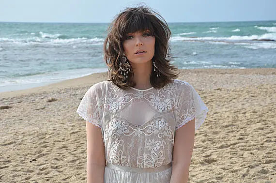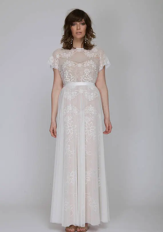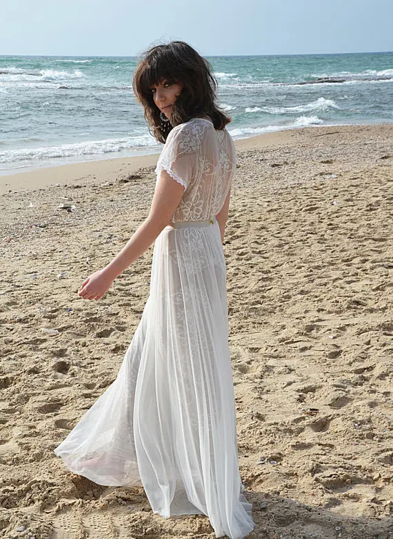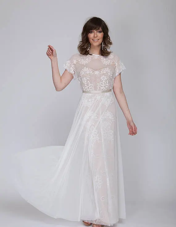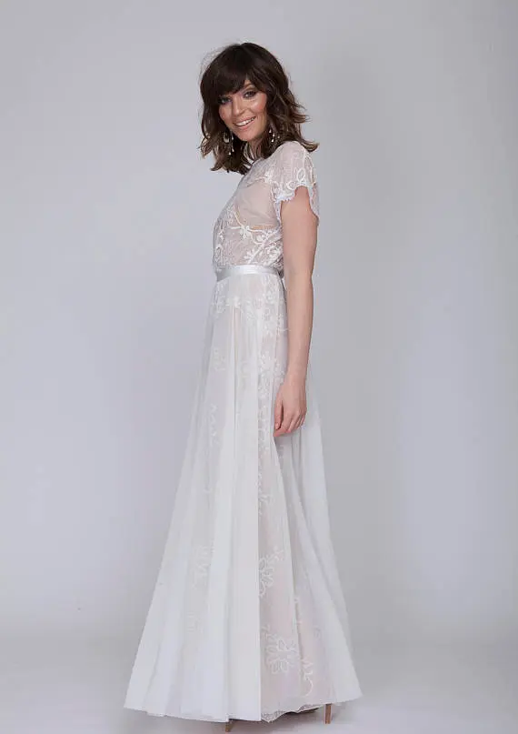 Lace wedding dress , this amazing broken white bohemian wedding lace dress, timeless and effortless for a laid back wedding , all over lace wedding dress with three layers of fabric , lace delicate sheer mesh and nude color lining.