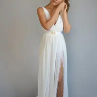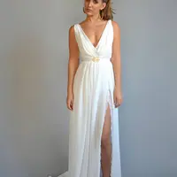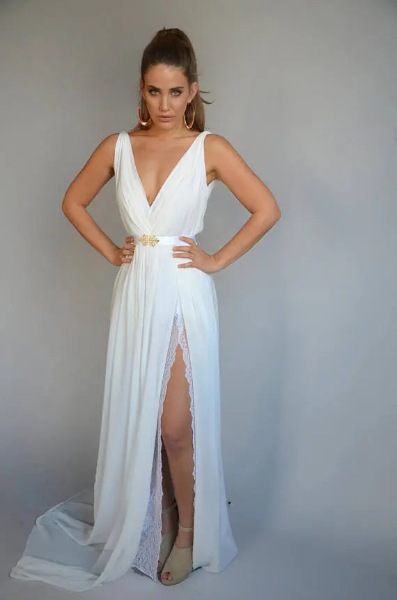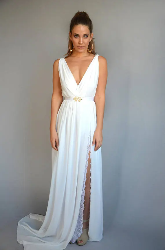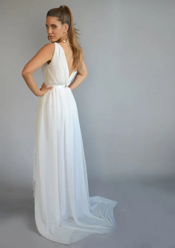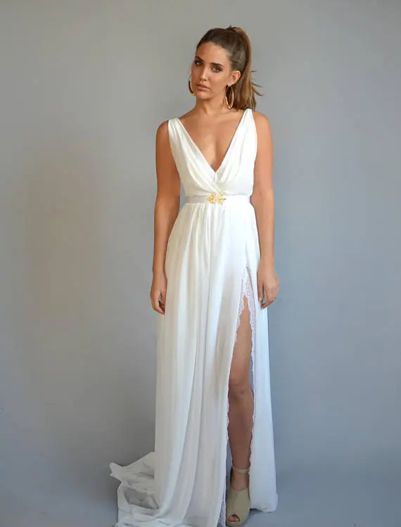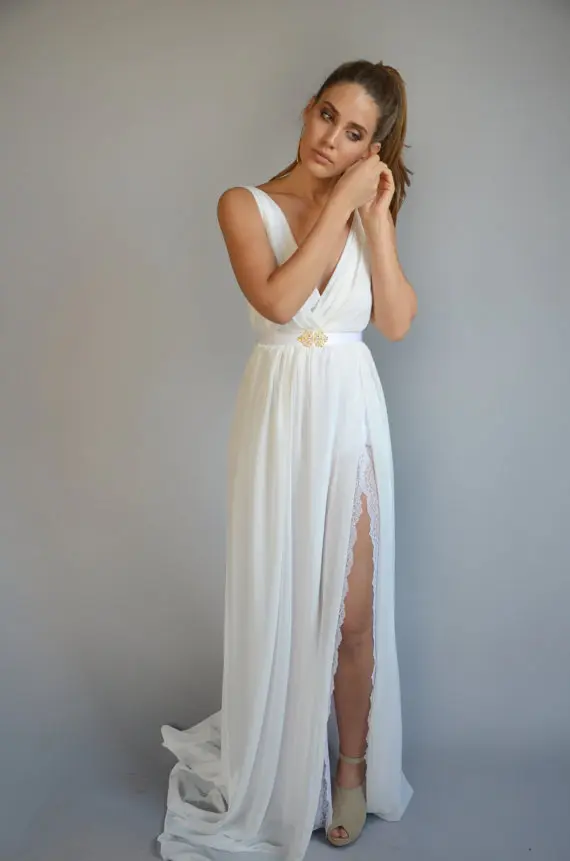 chiffon wedding dress, lace slit wedding dress, V neck wedding dress, open back wedding dress,chiffon wedding dress