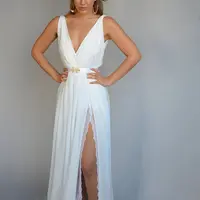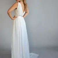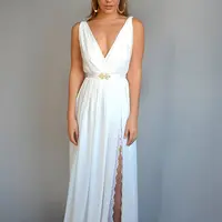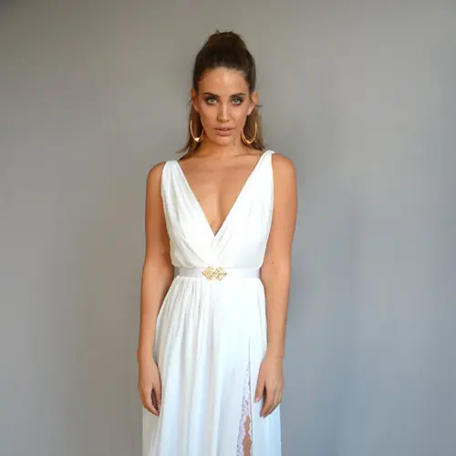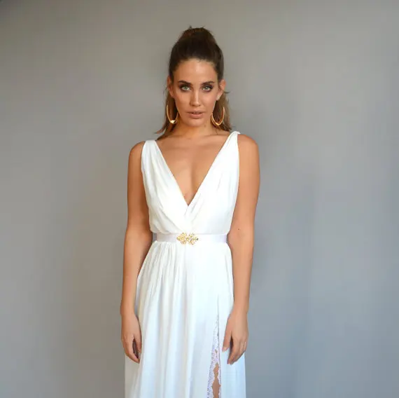 This stunning chiffon boho wedding dress perfect for a beach wedding or a garden wedding with golden jewelry belt.