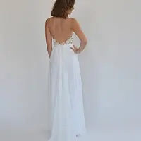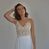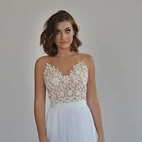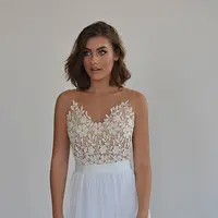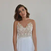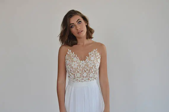 This chiffon boho wedding dress is perfect for a beach wedding or a garden wedding with beaded embroidery pattern on a sheer fabric.