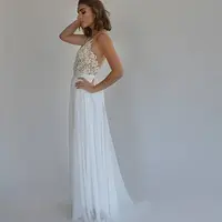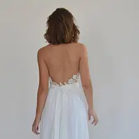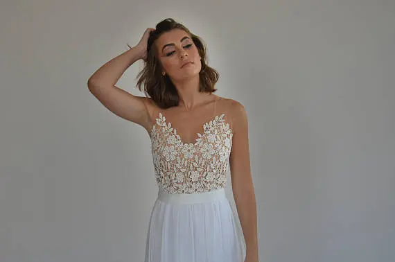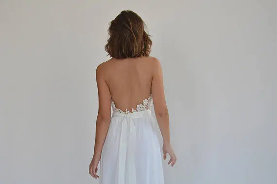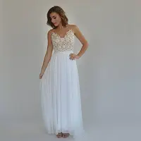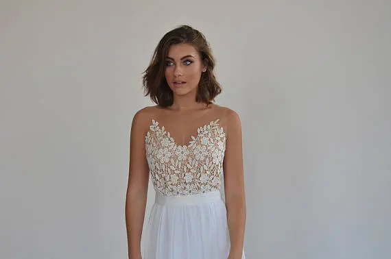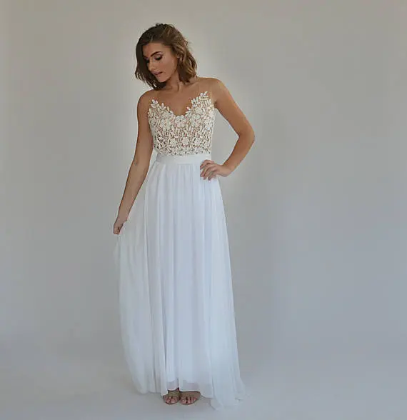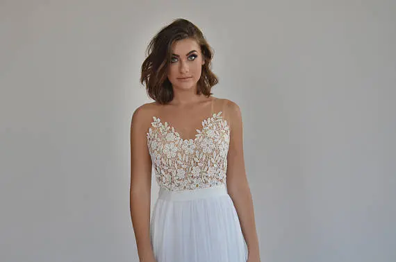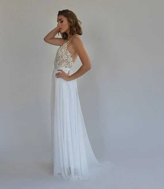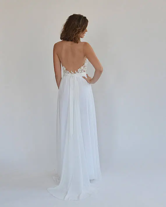 Boho wedding dress, embroidery top on a sheer mesh, open back wedding dress.