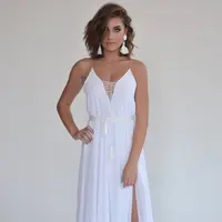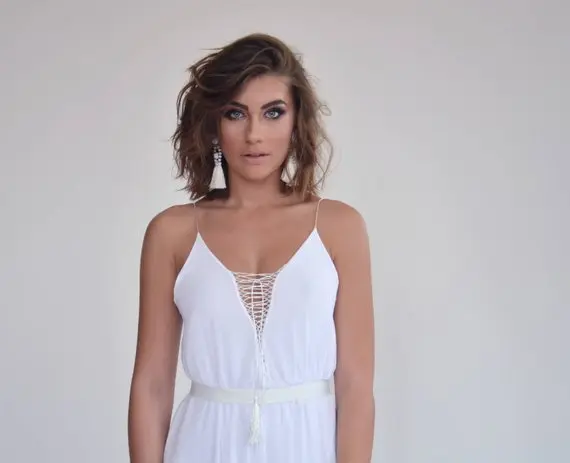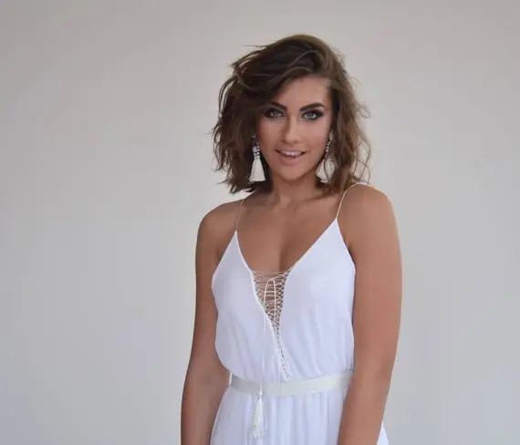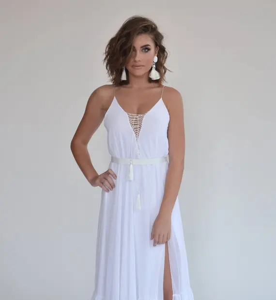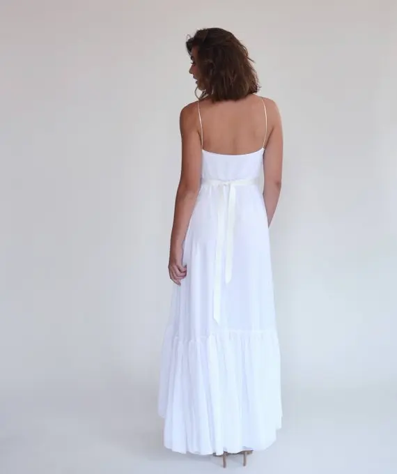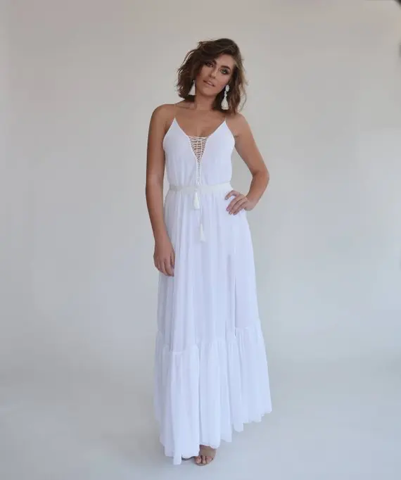This stunning chiffon boho wedding dress perfect for a beach wedding or a garden wedding with open V neck.