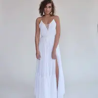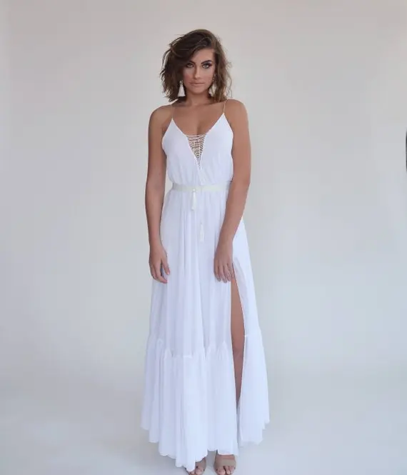 chiffon wedding dress, slit wedding dress, V neck wedding dress, boho wedding dress, simple wedding dress