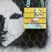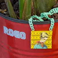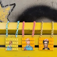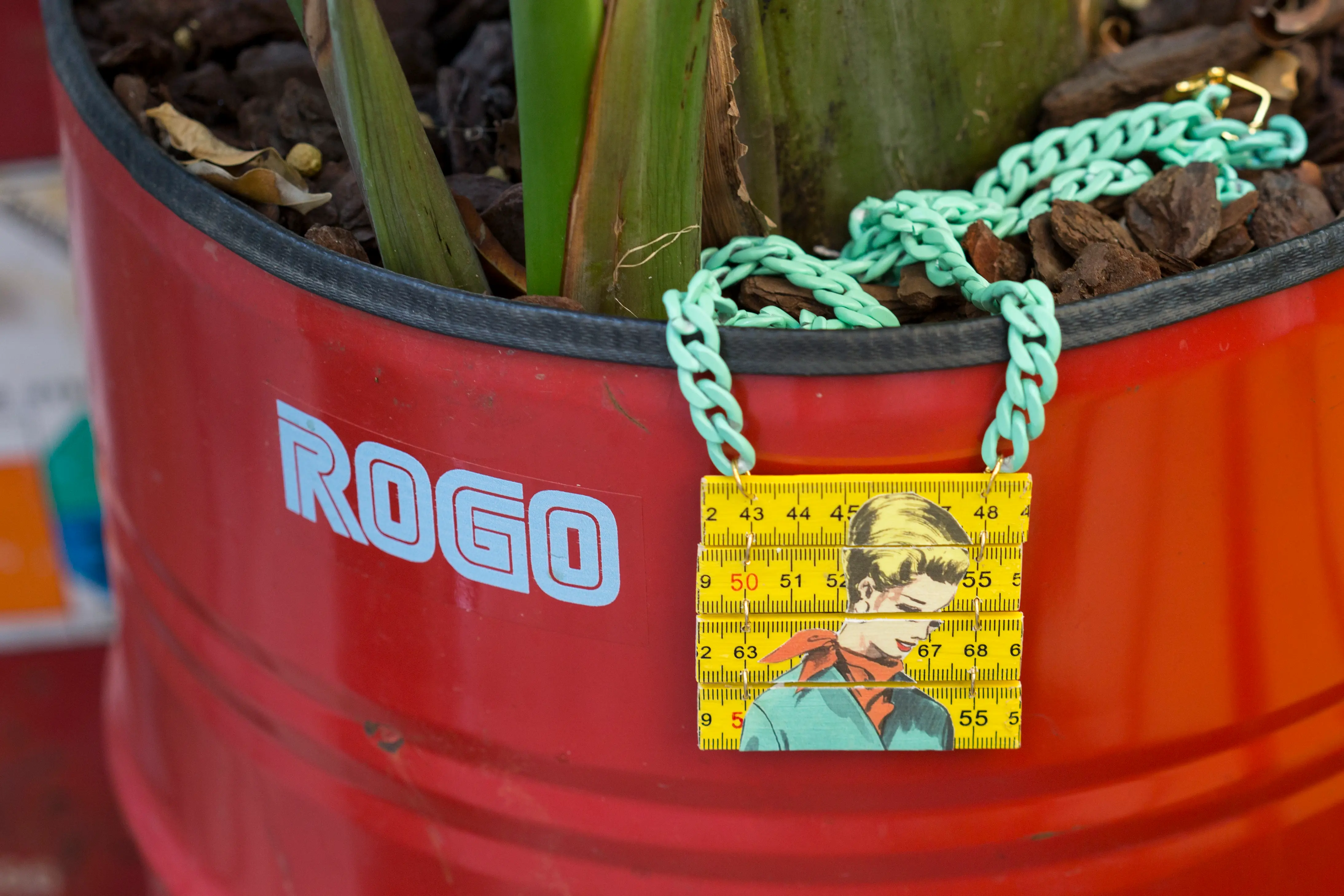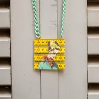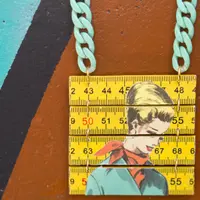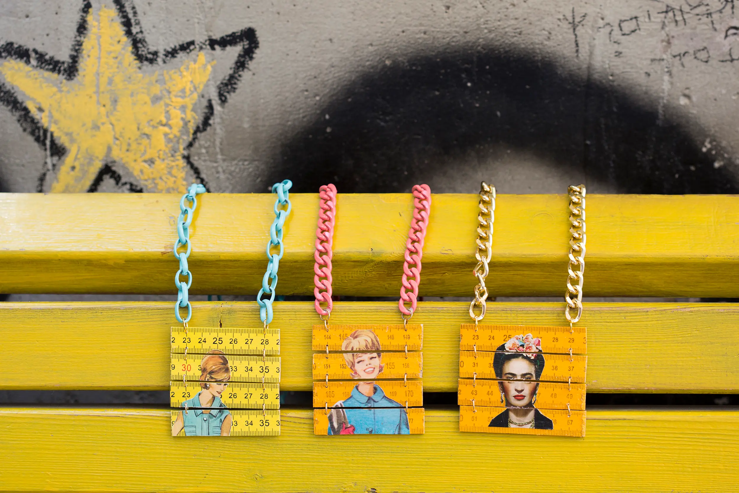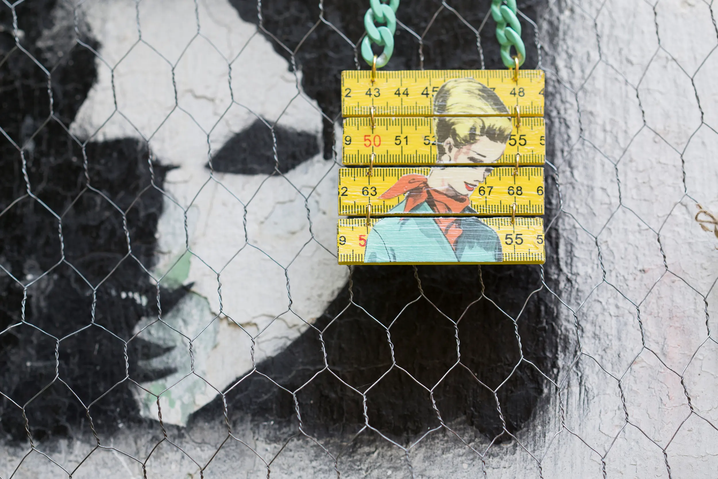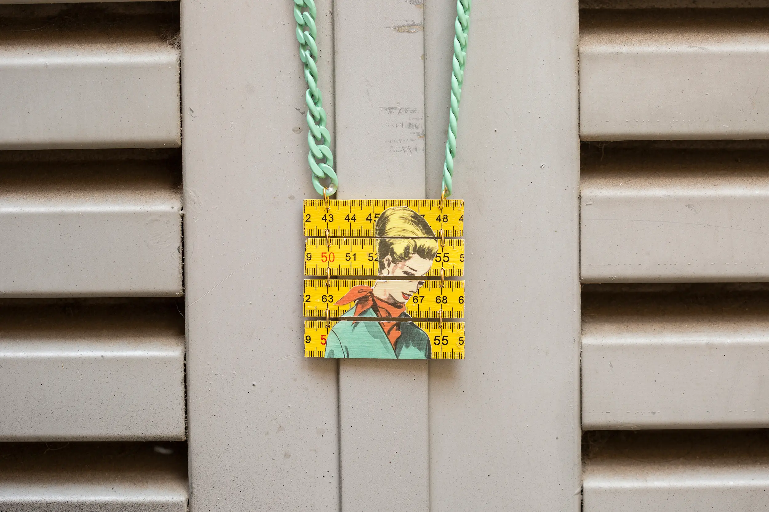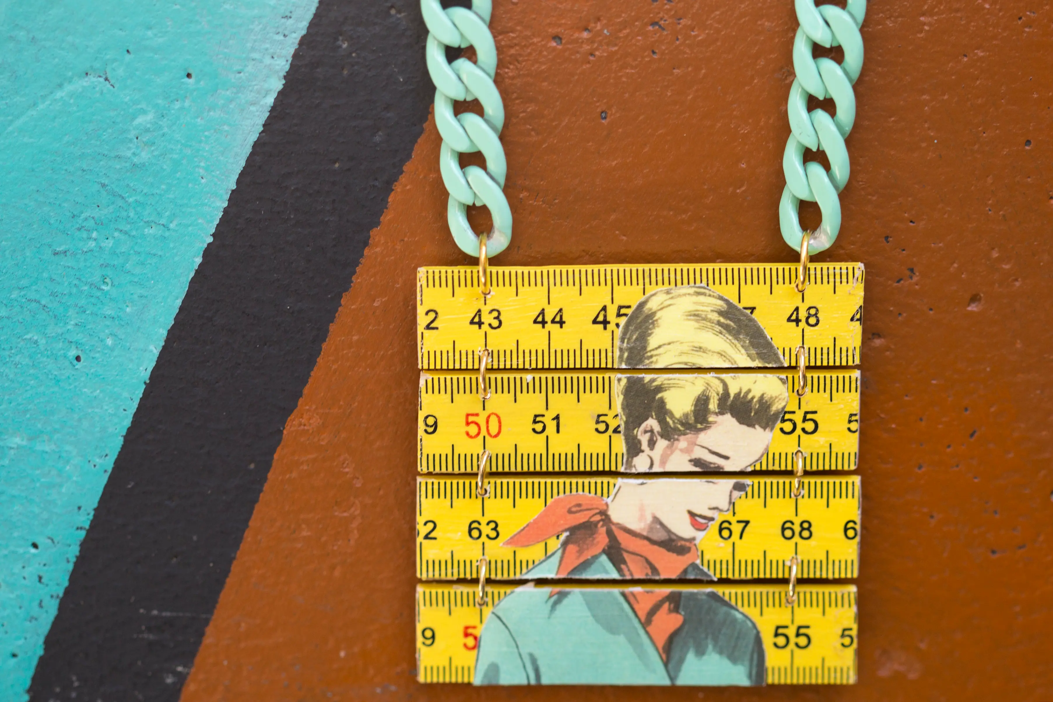 a statement necklace made from a yellow folding ruler with a woman figure from the 60's/