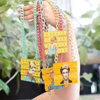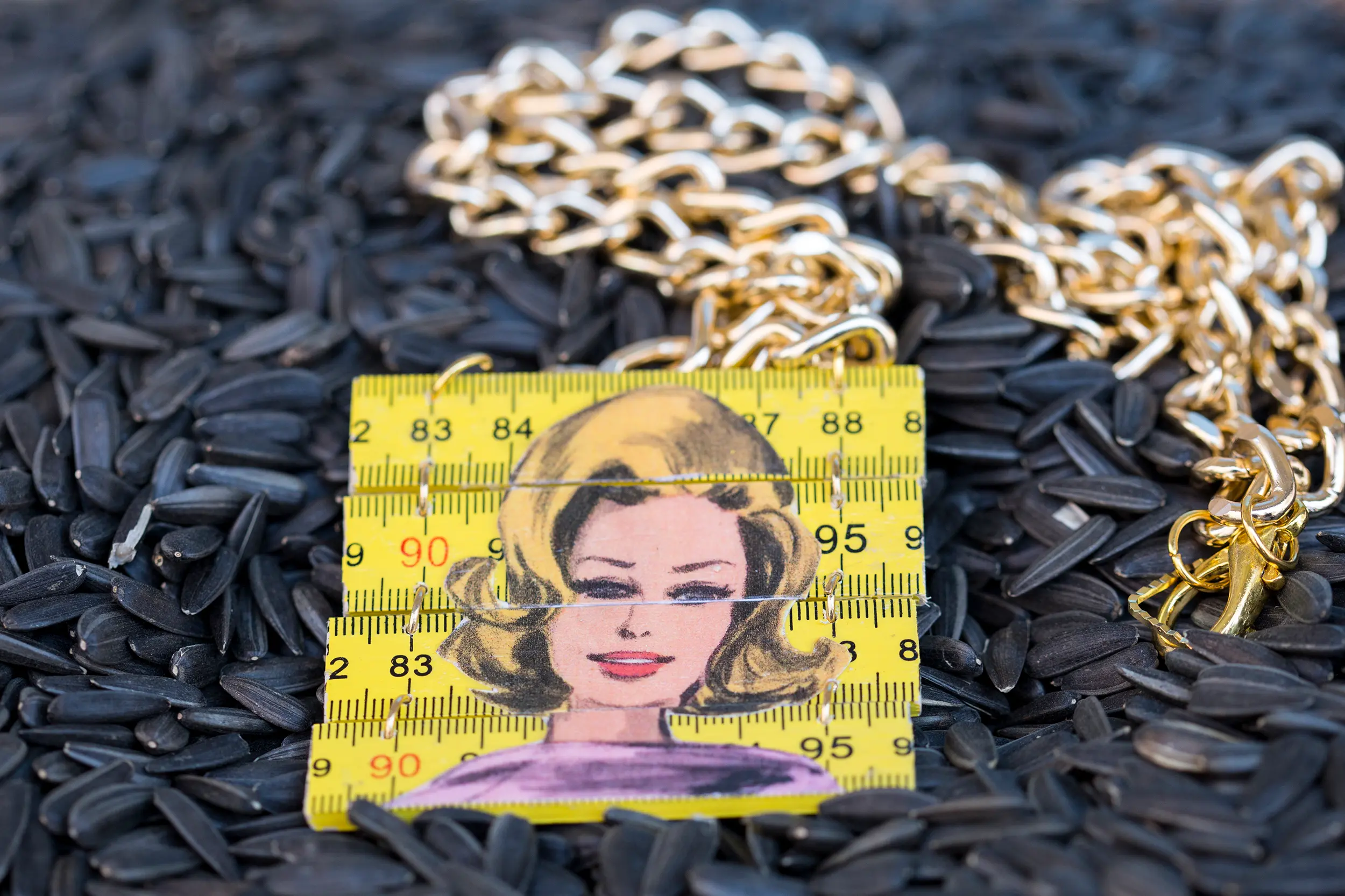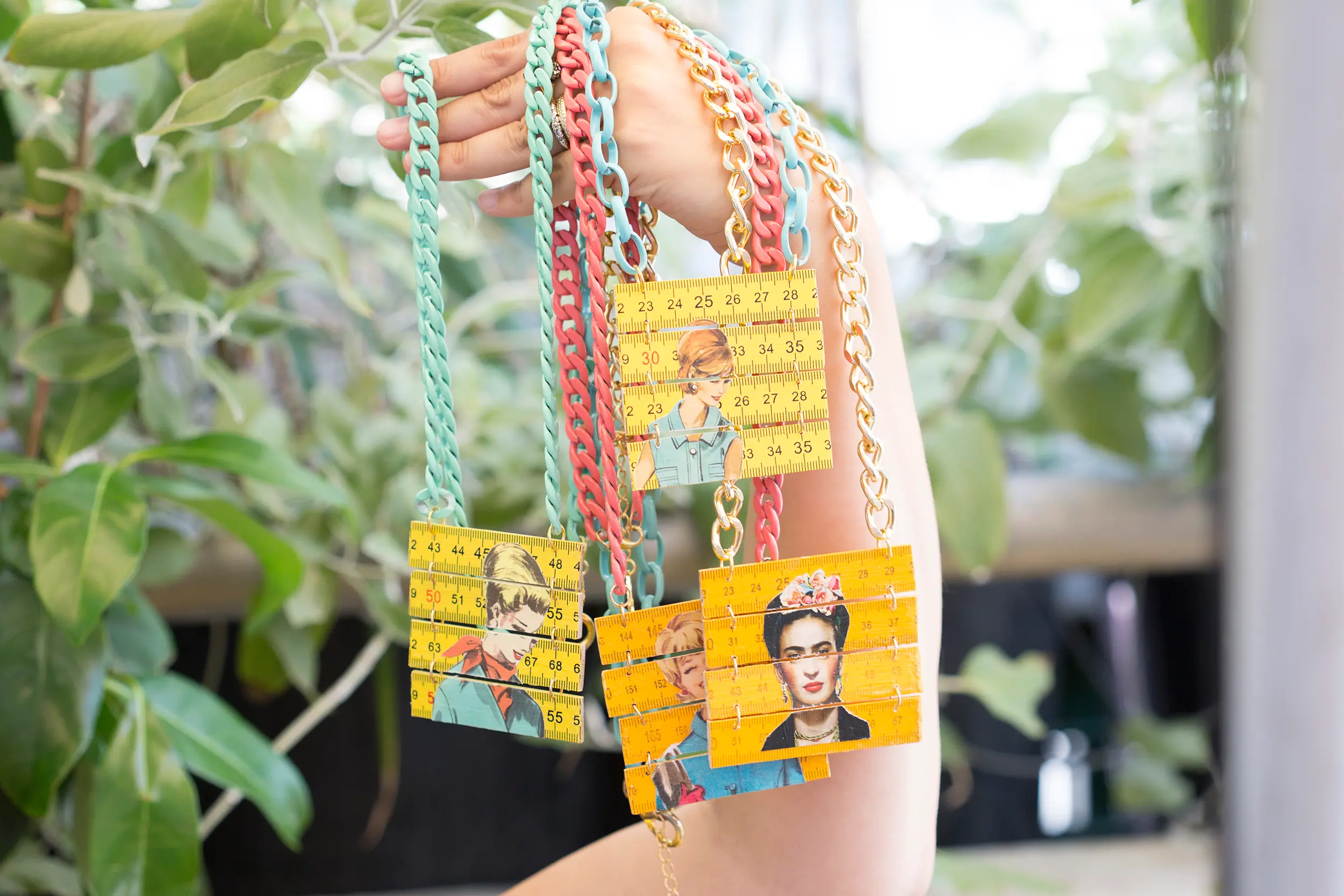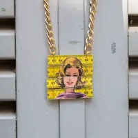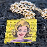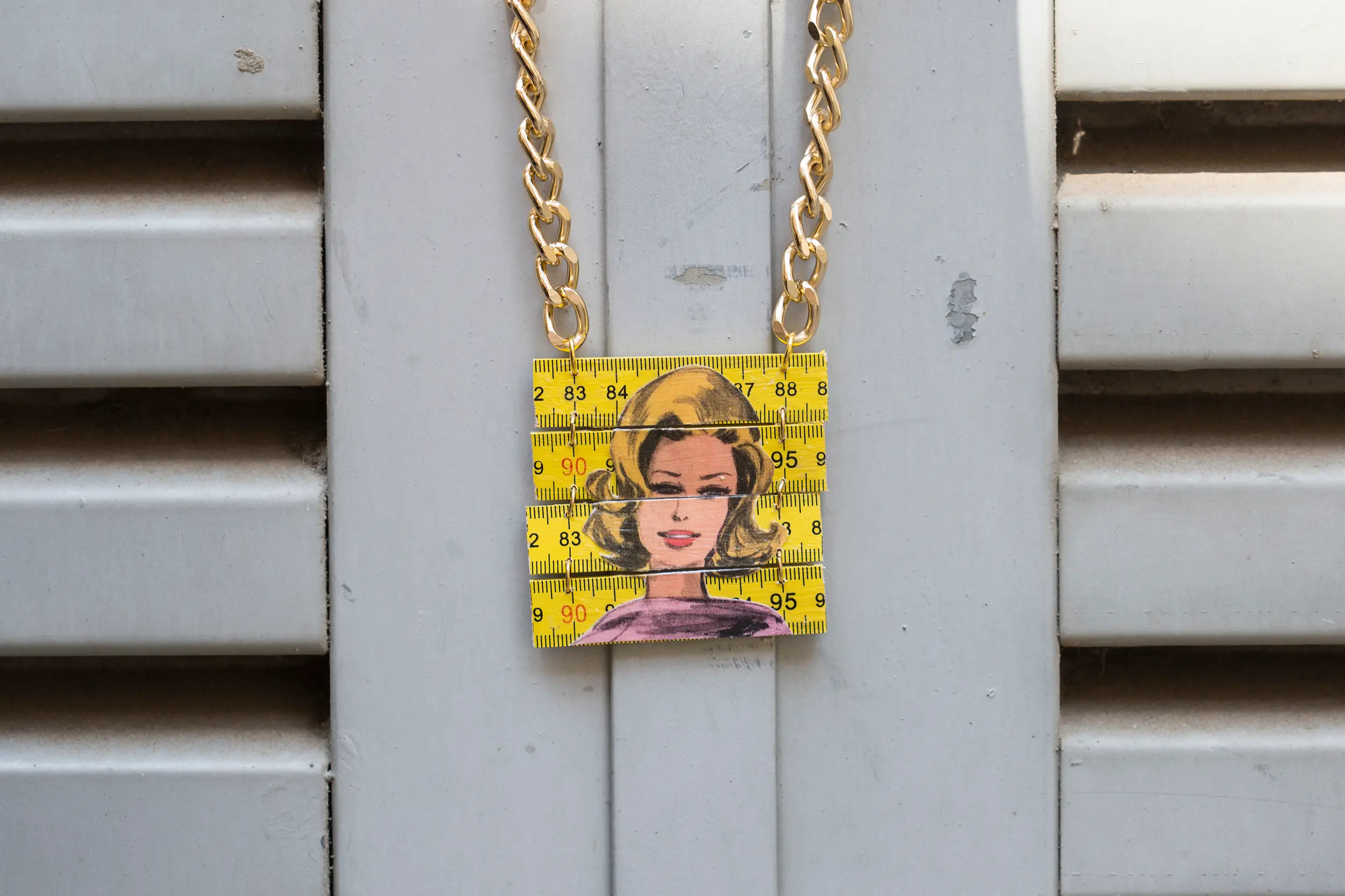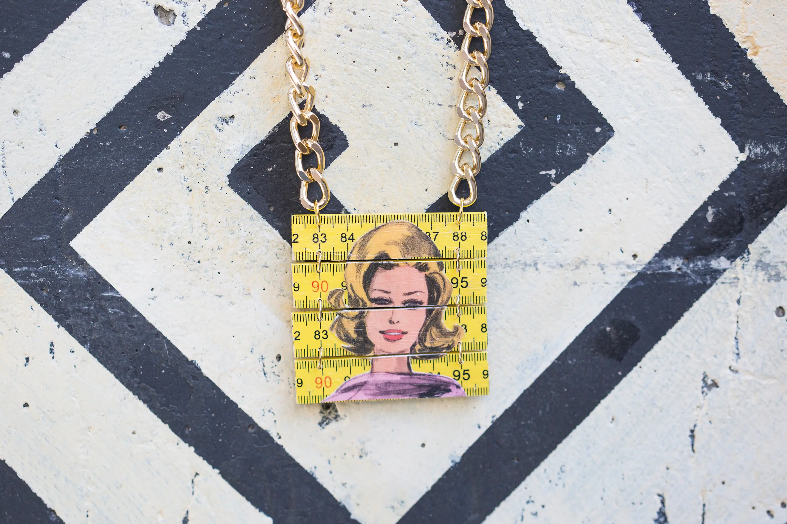 • a statement necklace made from a yellow folding ruler with a woman figure from the 60's