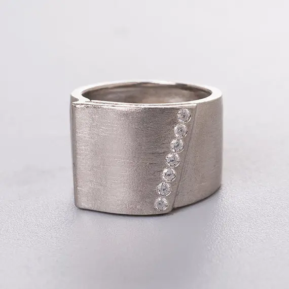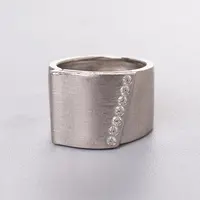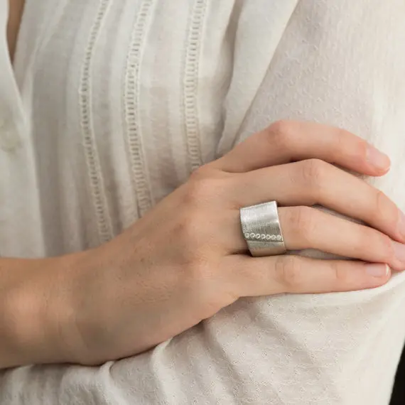 This is a wide wedding ring made of 14K white gold with matte brushed texture set with seven diamonds of 2 points each.