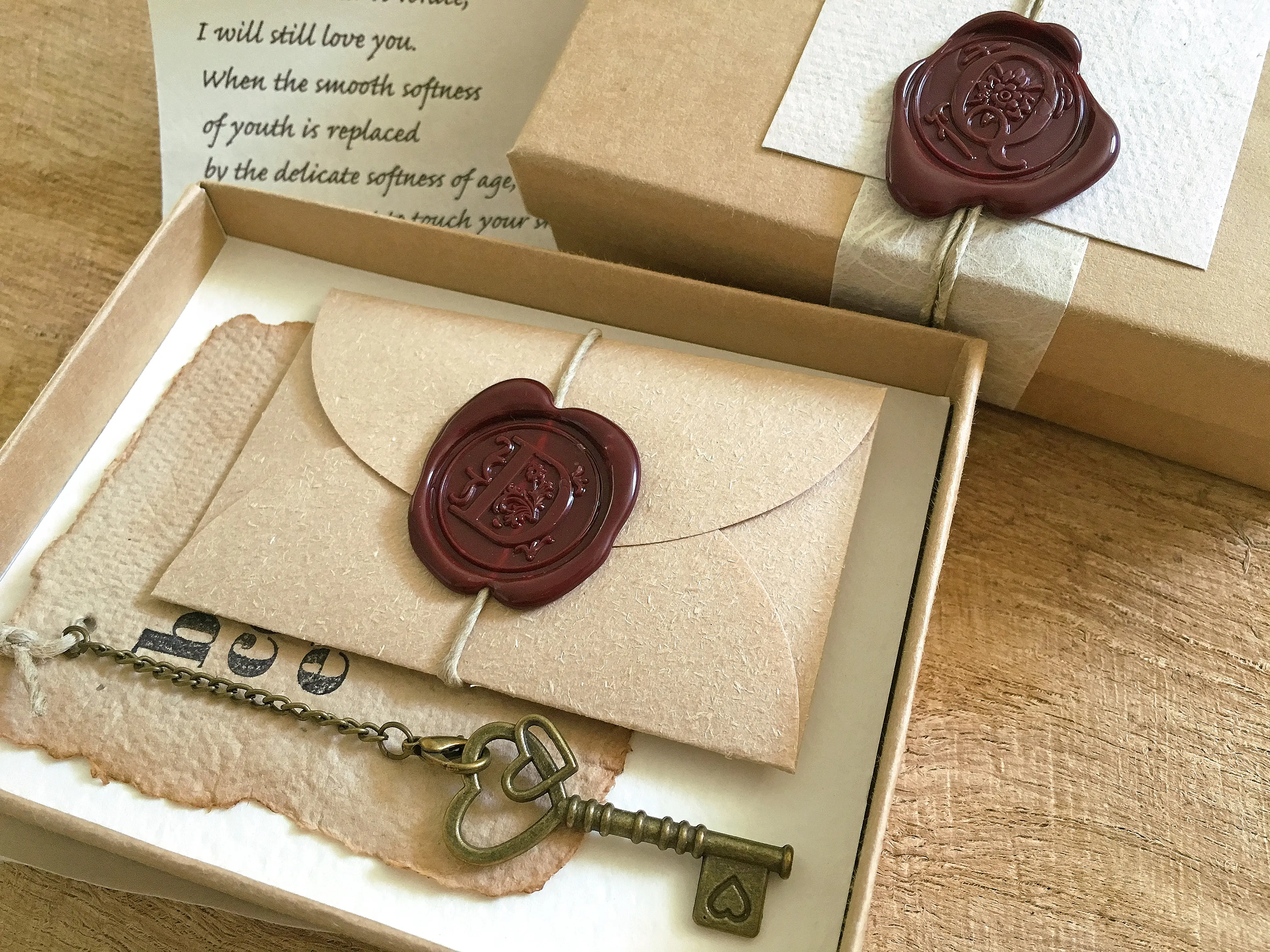 Share a special sentiment with your beloved with this Treasure Box of Love. Custom handmade, it features a Kraft box that opens to reveal a personalized love note and a handmade paper card with a key to my heart dangles from it beautifully. The box is sealed with a stamped wax seal to complete the sentiment. Your recipient will be impressed with the sentiment and it will surely be cherished. DESCRIPTION: Personalized love note sealed with a personalized wax stamp Kraft box sealed with a personalized wax stamp Key to your heart" Handmade paper card with a vintage style key This item is made-to-order. PLEASE LEAVE THE REQUIRED INFORMATION: 1. Stamp - Your initial - 1 letter 2. Short love quote or a few love words - UP TO 200 WORDS 3. Your anniversary date 4. Color of wax stamp: Bright Red / Dark red / Gold MEASURES: Box - about 5" x 4" x 1 1/4" Your gift will arrive in a gift-wrapping, ready to be given. Please Note all items are created by me alone; therefore, orders take about 1 to 1 1/2 weeks. If you are in need of rush service, please contact me via e-mail or a Convo. Please advise, you may message me for questions not covered in this platform Note: Additional duty tax may be charged at time of delivery. This is not covered in your purchase price.
