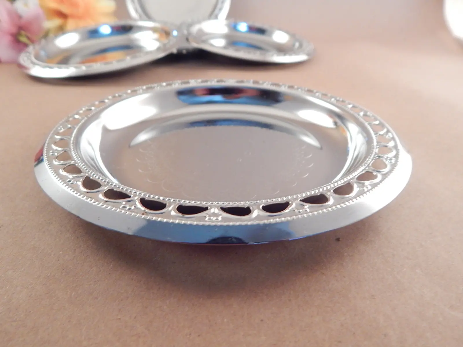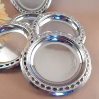 coasters, vintage, silver, silver plated, ornate, fine dining, candle trays, candy dish, nut dish, serving dish, beverage serving, silver tray, barware, tableware
