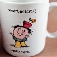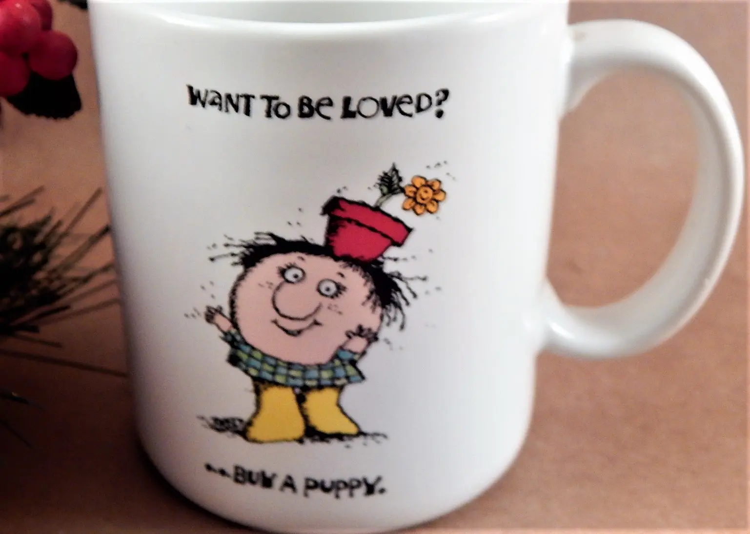 White ceramic mug reads "Want to be loved?...Buy a Puppy"