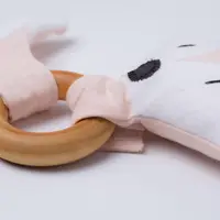 Wooffy is an eco-friendly baby teething toy that is made of soft GOT certified organic cotton and organic flannel fabrics, in natural dark orange and white colors. It is filled with GOT certified organic cotton batting.
