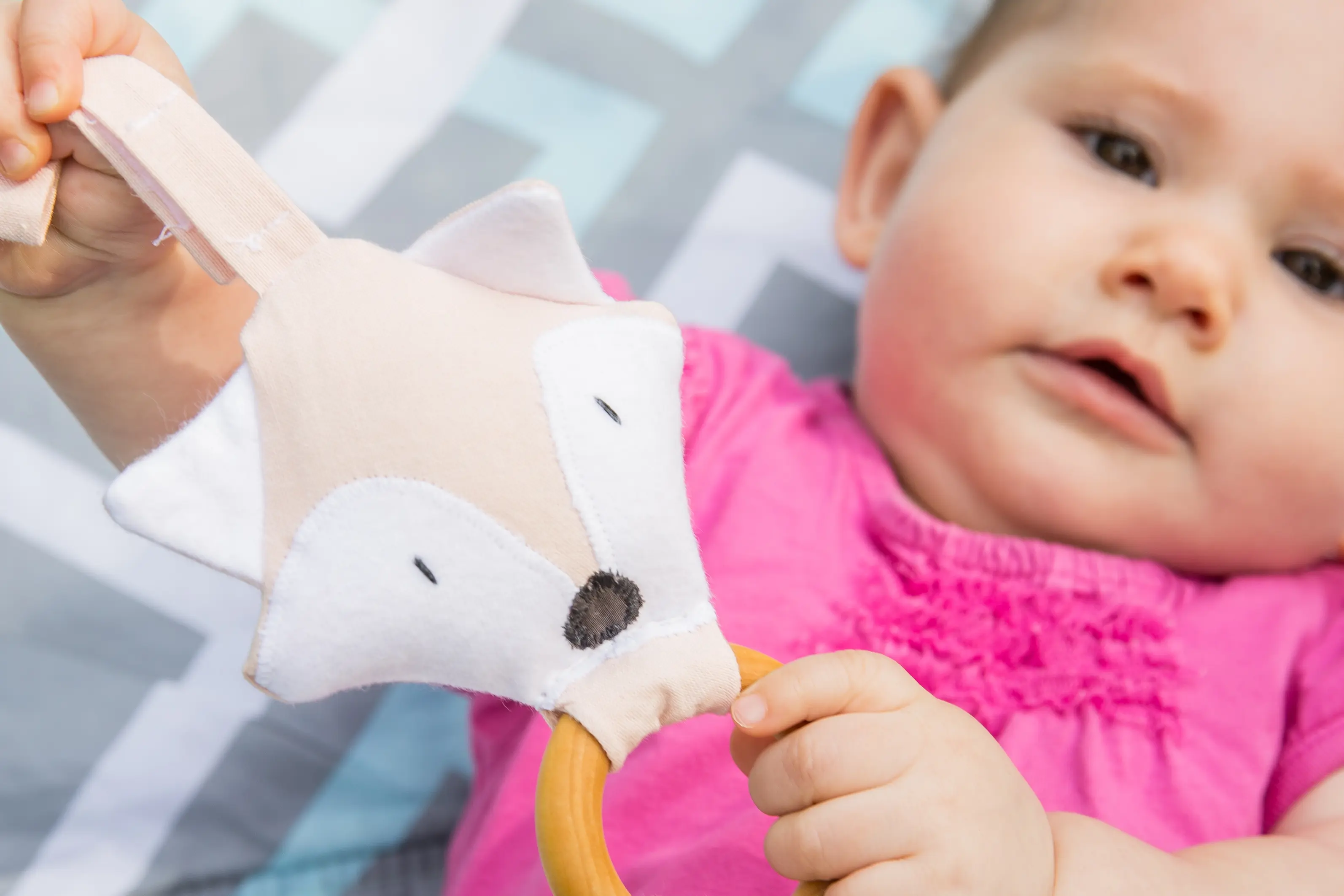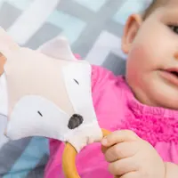 CPSIA and EN71 compliant crinkle material is sewn right in between the two fabric layers of the ears and tail of the fox to provide another level of sensory experience for your baby.
