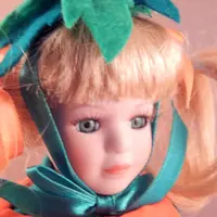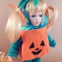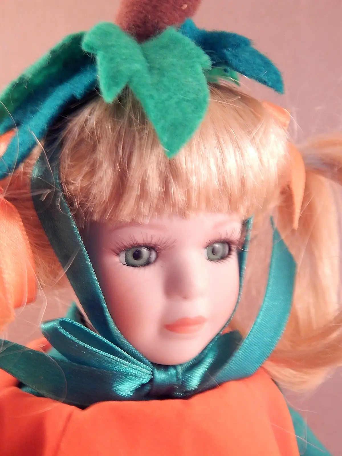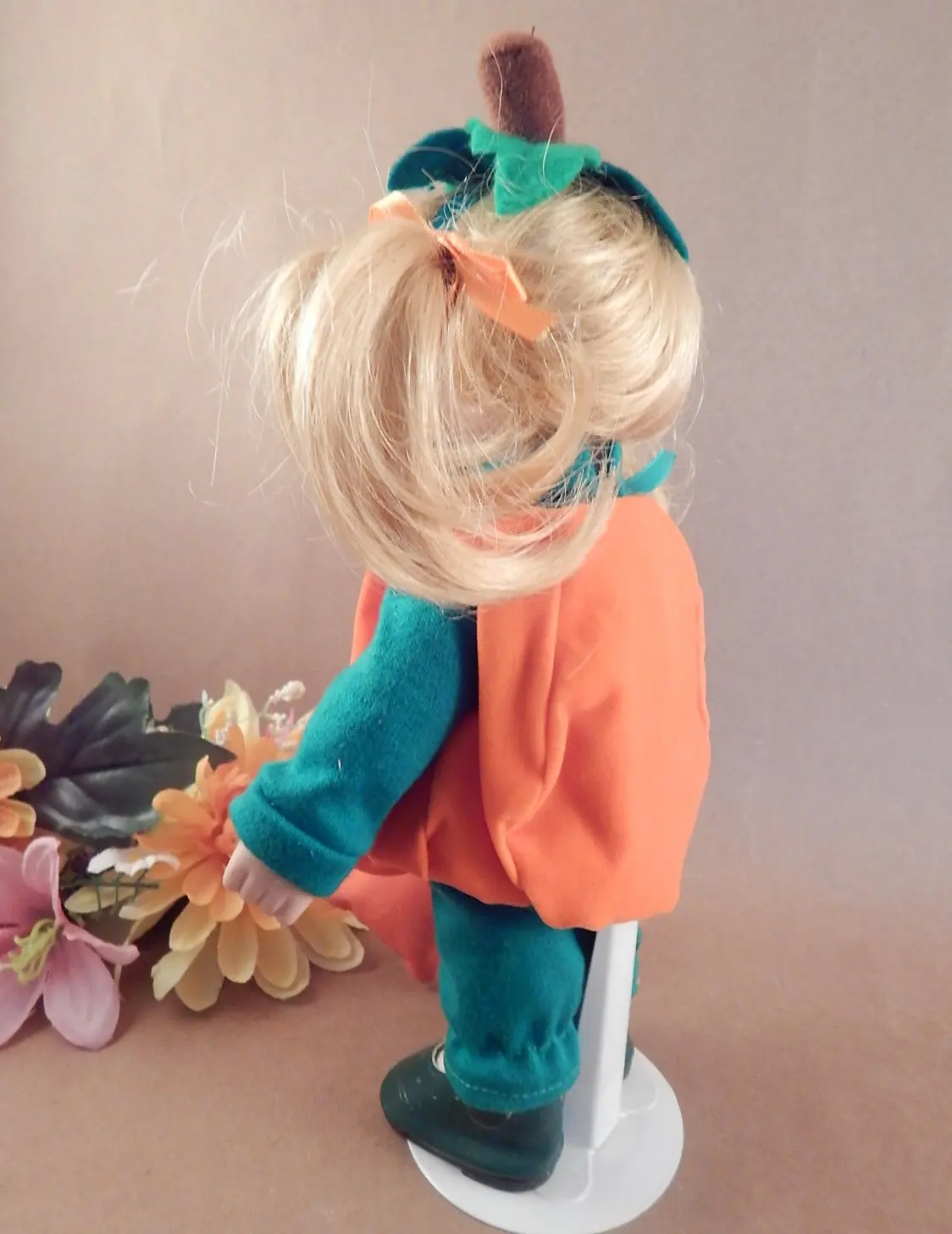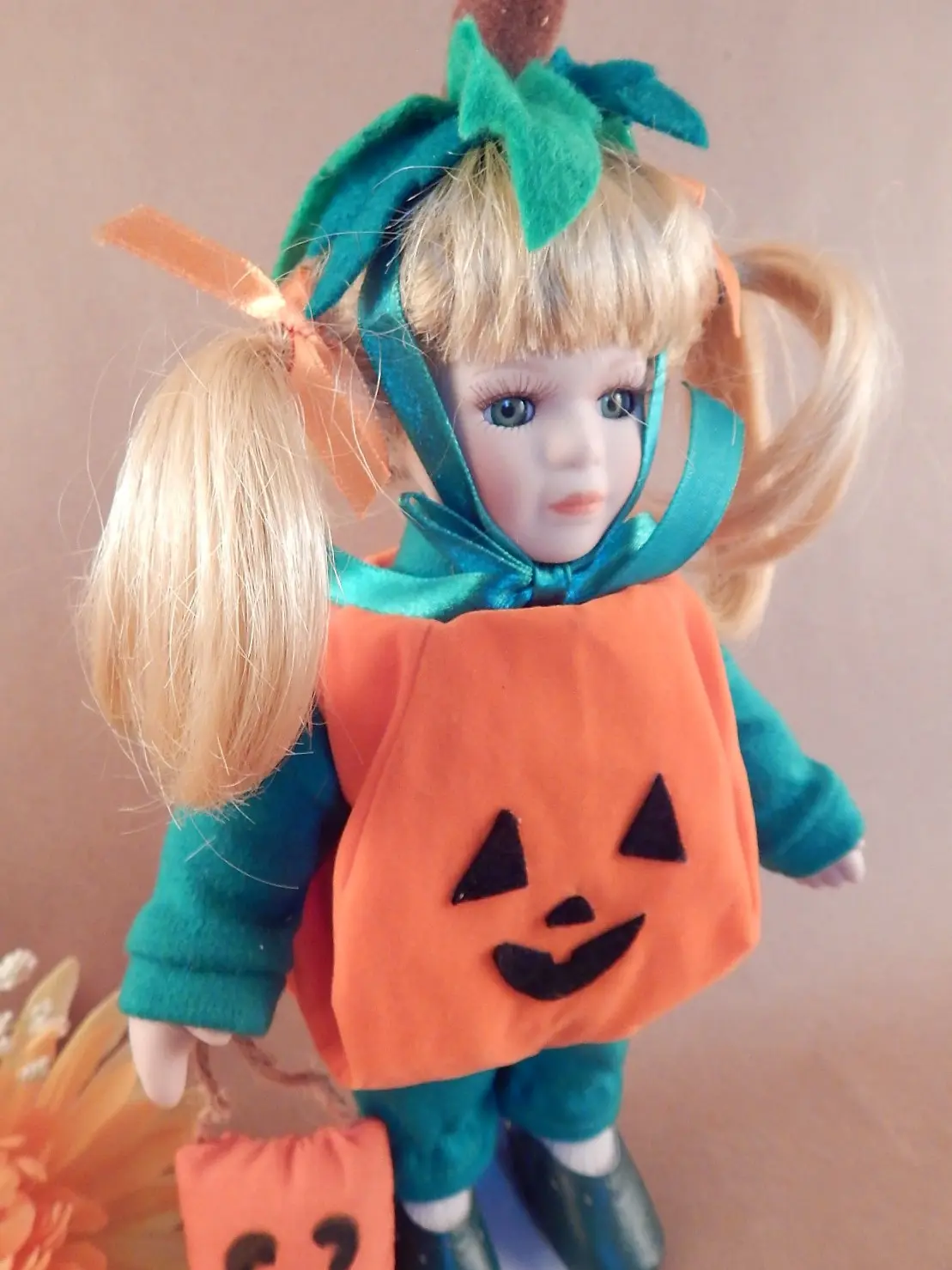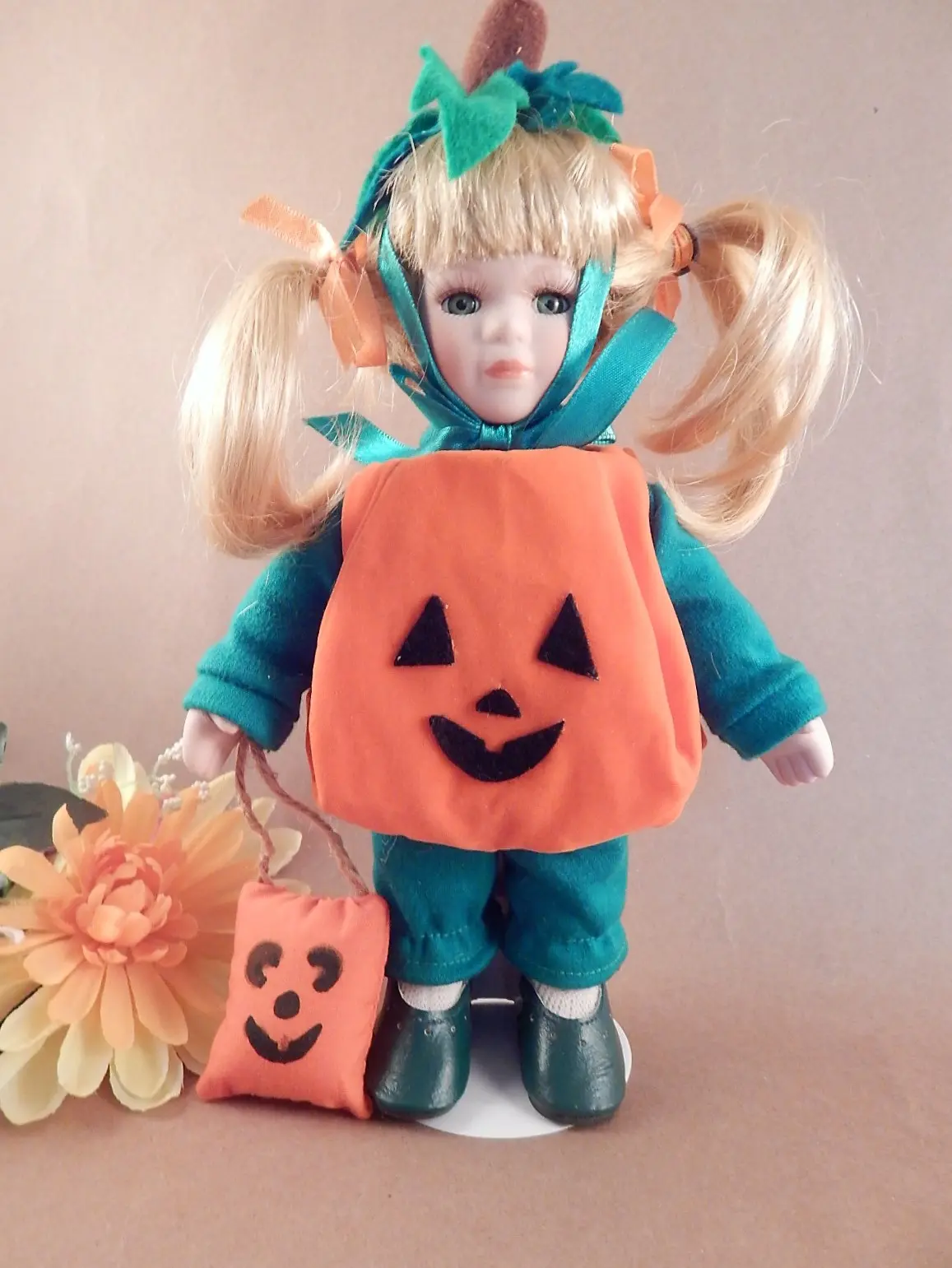 Doll Pumpkin Halloween Costume Blonde Girl Porcelain with Stand 9" Keepsake Collectible Display Doll Fall Home Decor
