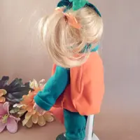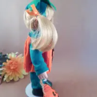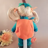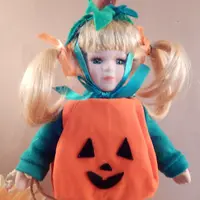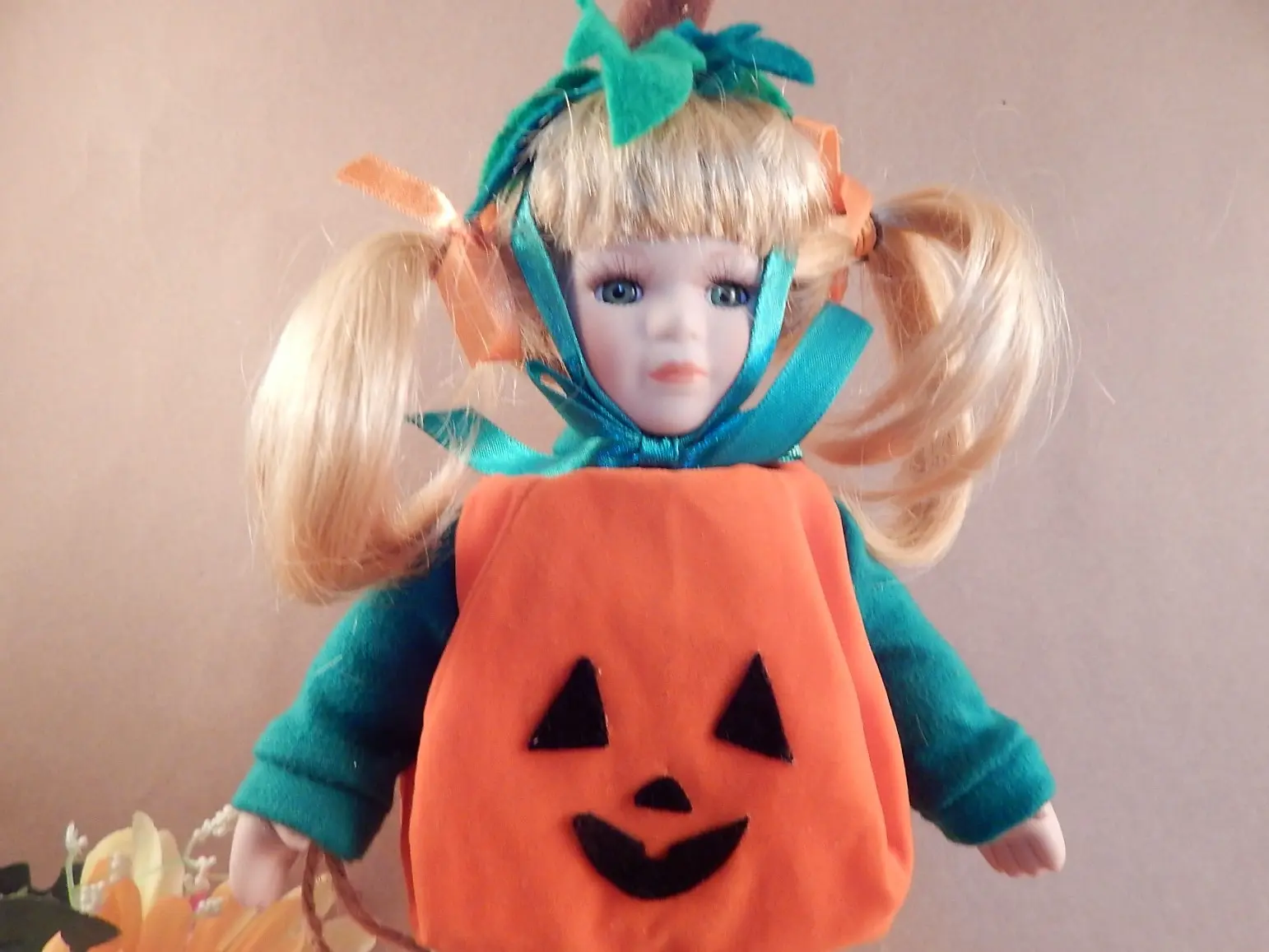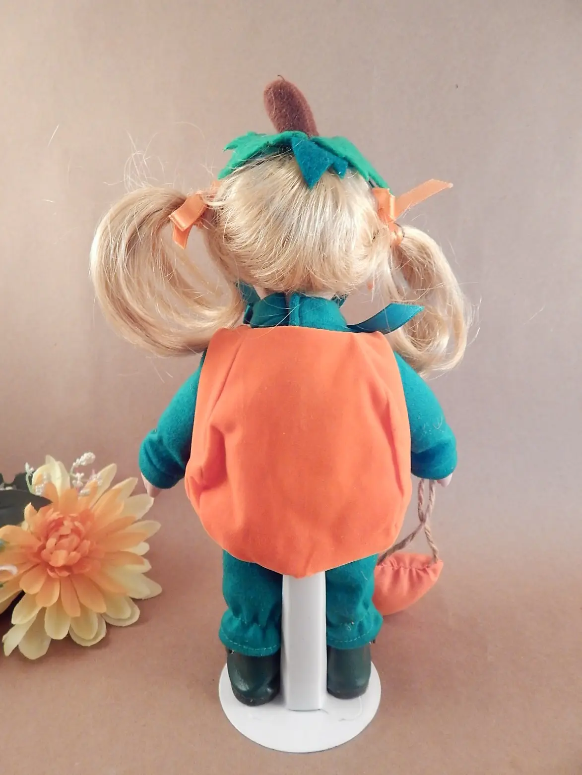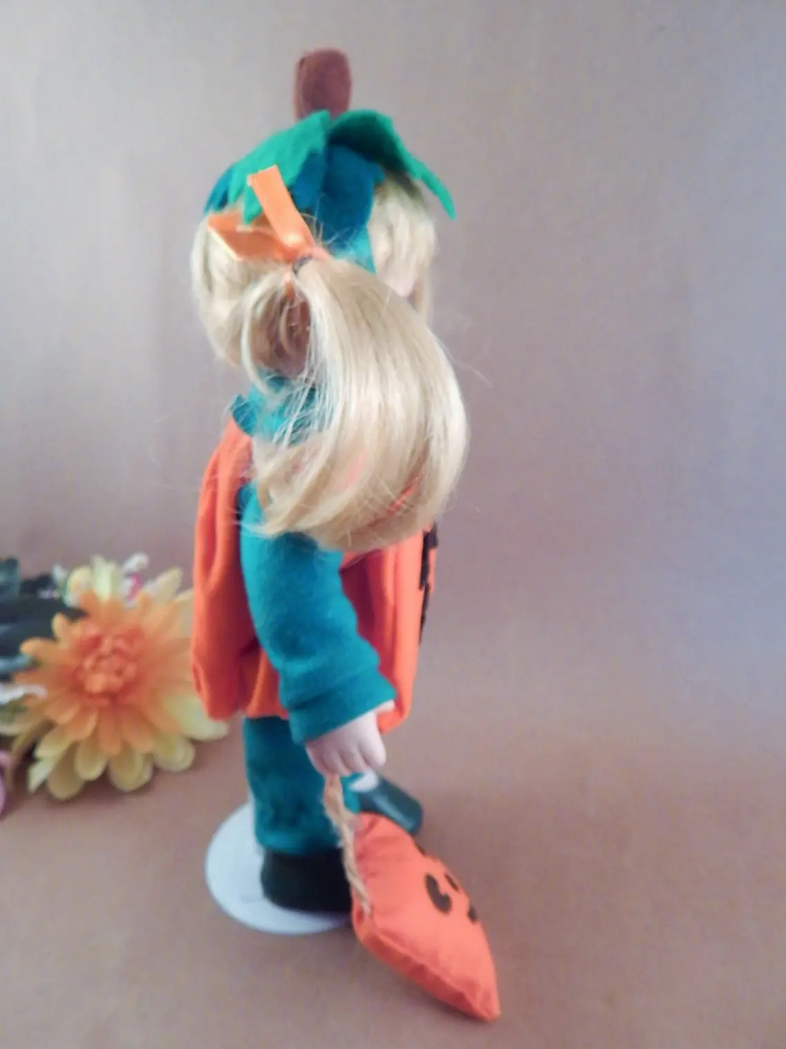 doll, halloween decoration, halloween doll, pumpkin costume, blonde doll, anco doll, trick of treat girl, fall home decor