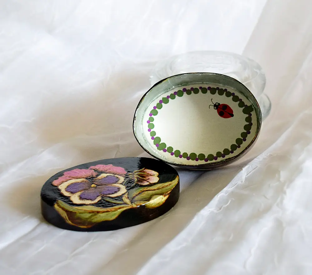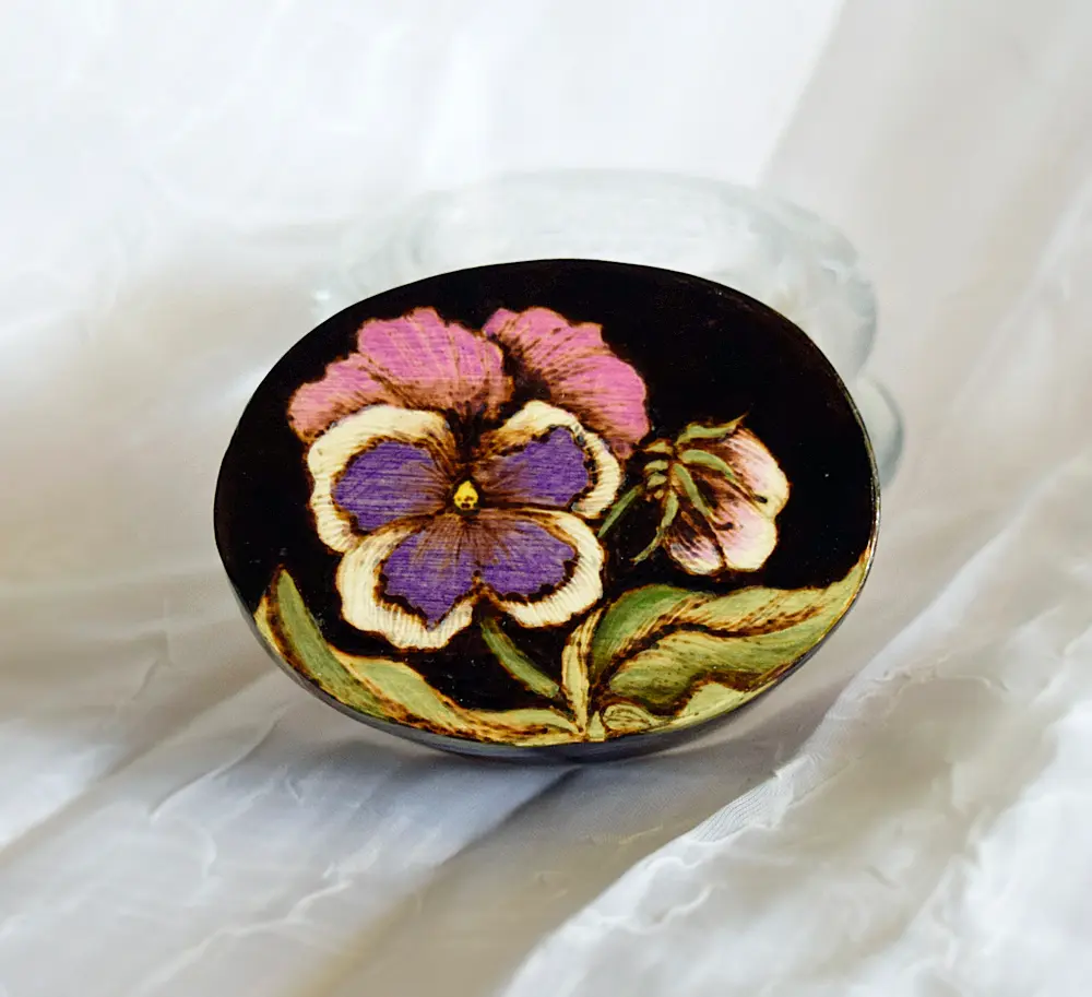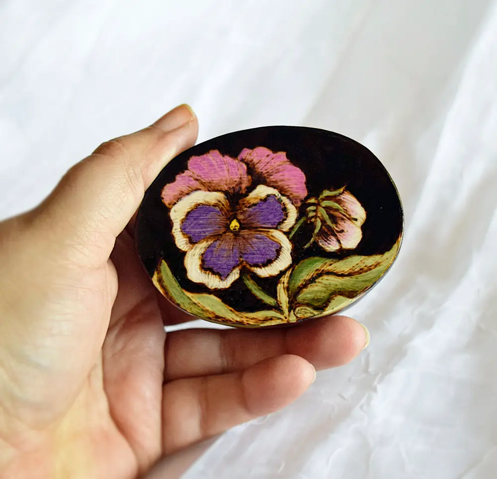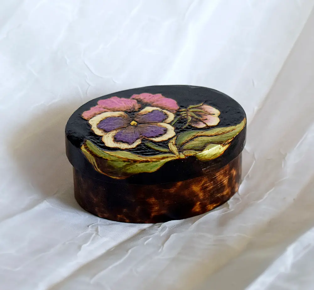 This Trinket box is Pyrographed, (woodburned) and tinted with watercolor, sealed with satin finish polyurethane. The inside is hand painted with a subtle embellishment to bring a smile to your face.