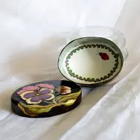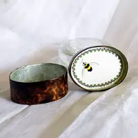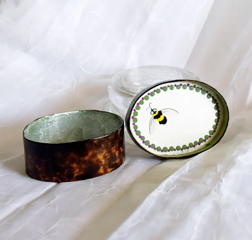 Dimensions approximately 4" Oval, Maybe 2.5" Tall with lid.